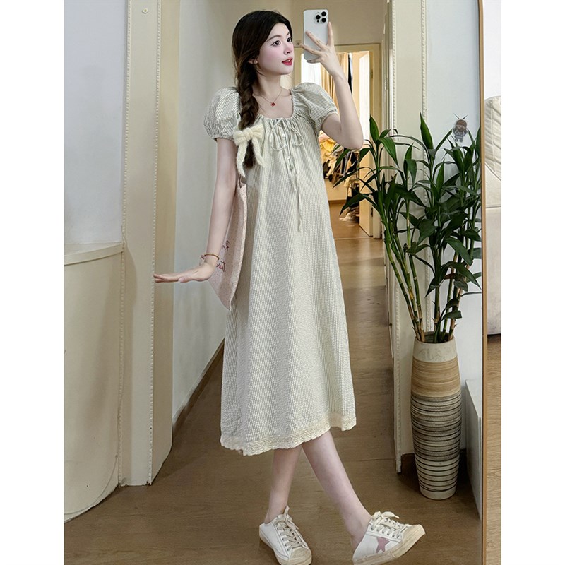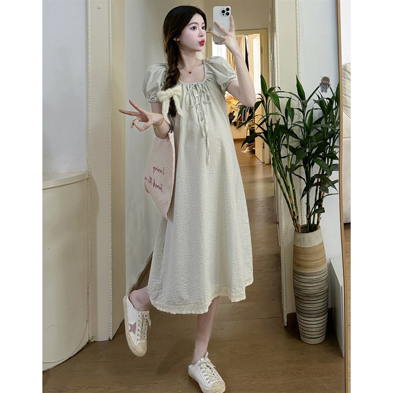 孕妇连衣裙清新条纹抽绳宽松泡w泡袖薄款时尚女中长款2024新款夏