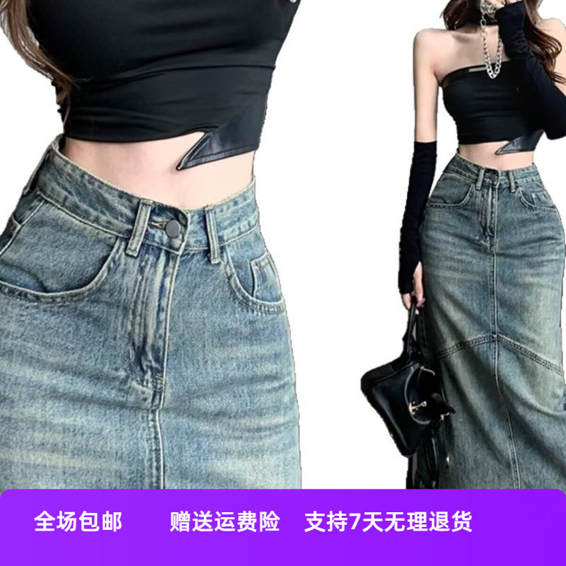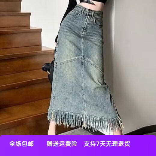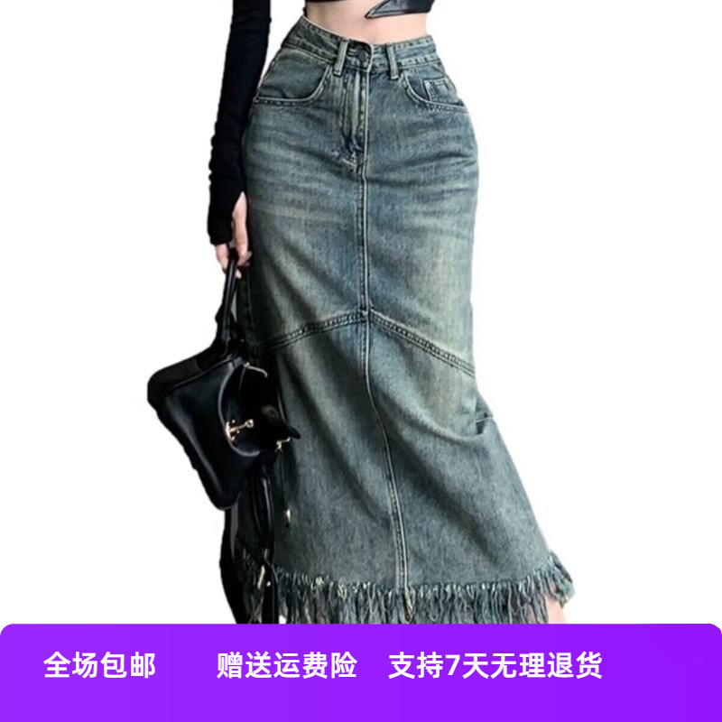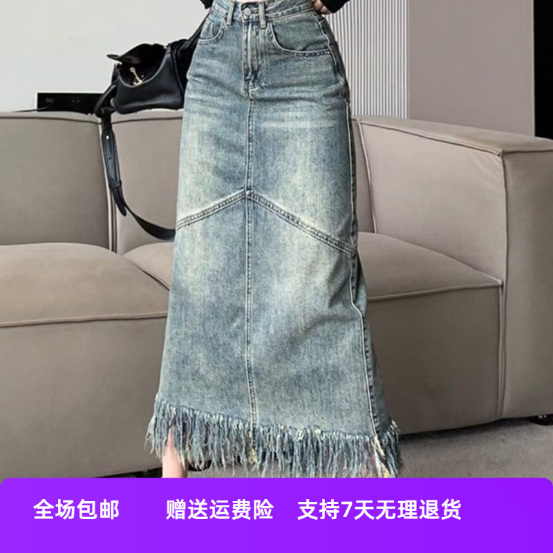 小众a半身裙包臀高腰复古设计感中长裙字牛仔显瘦女春秋开叉流苏