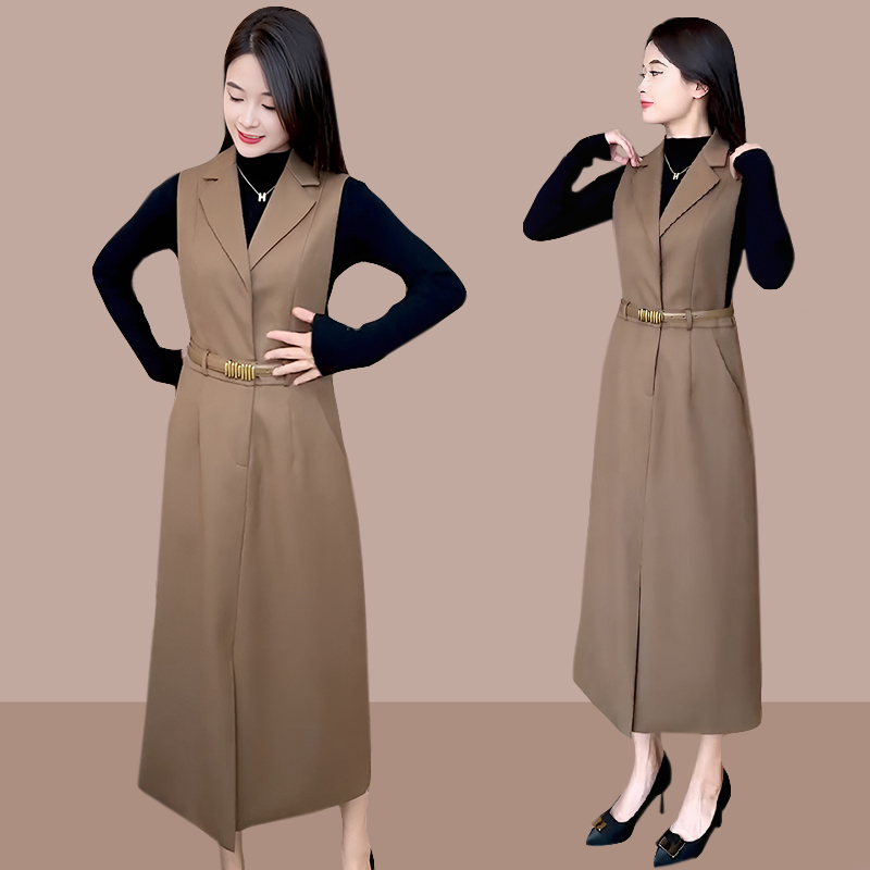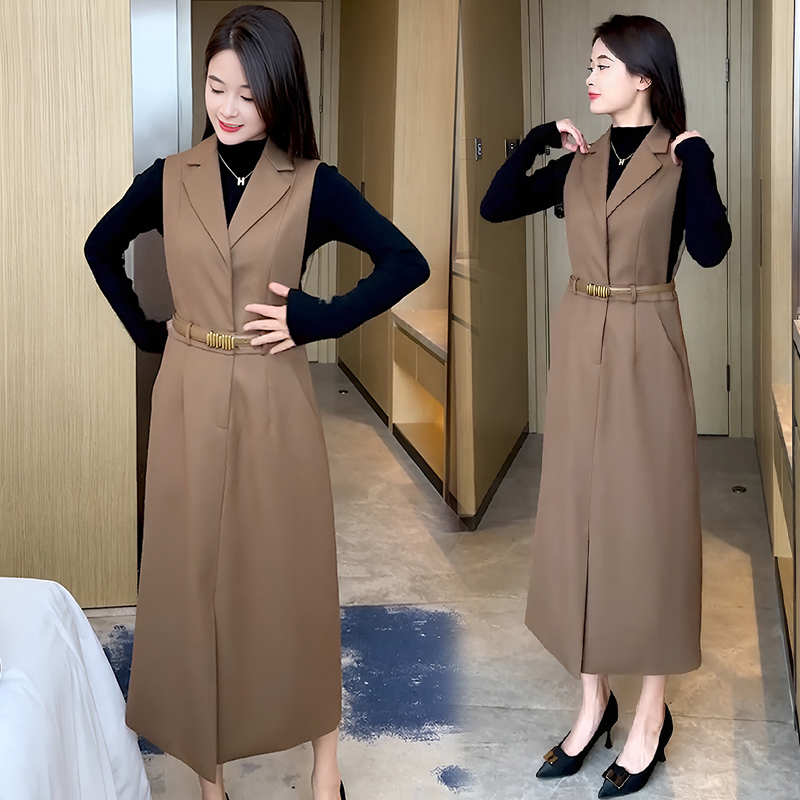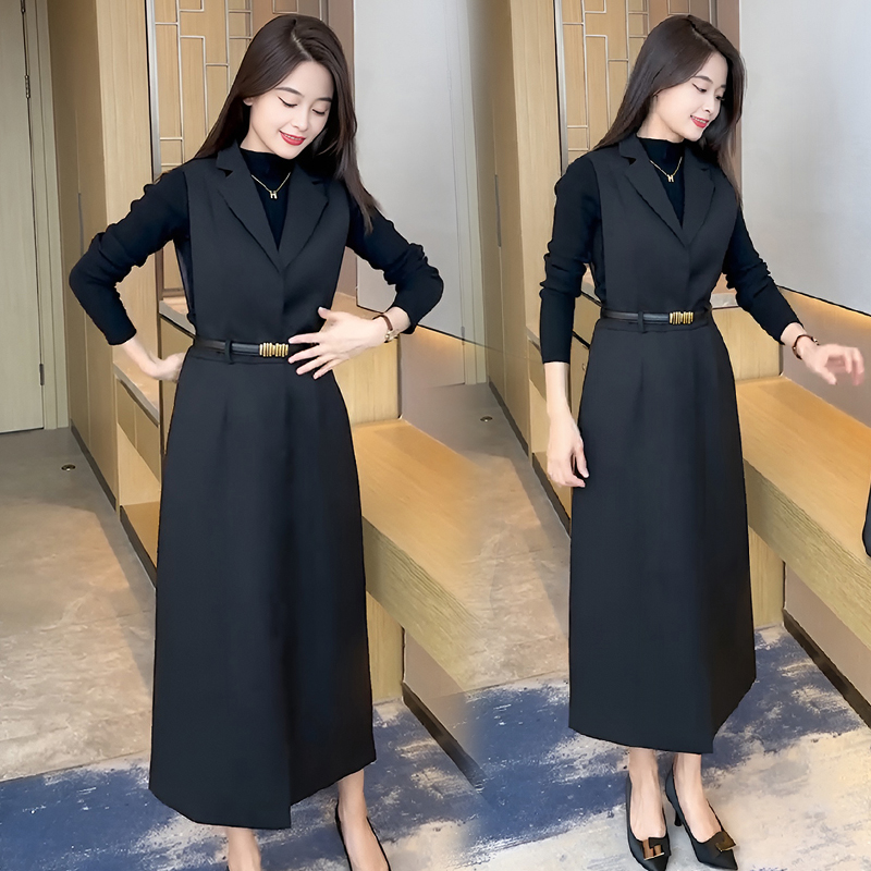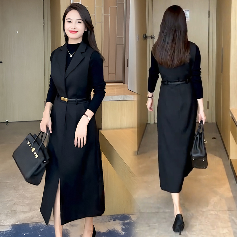 2025年春秋时尚轻职风毛衣背心裙两件套女西装领中长款收腰套装裙
