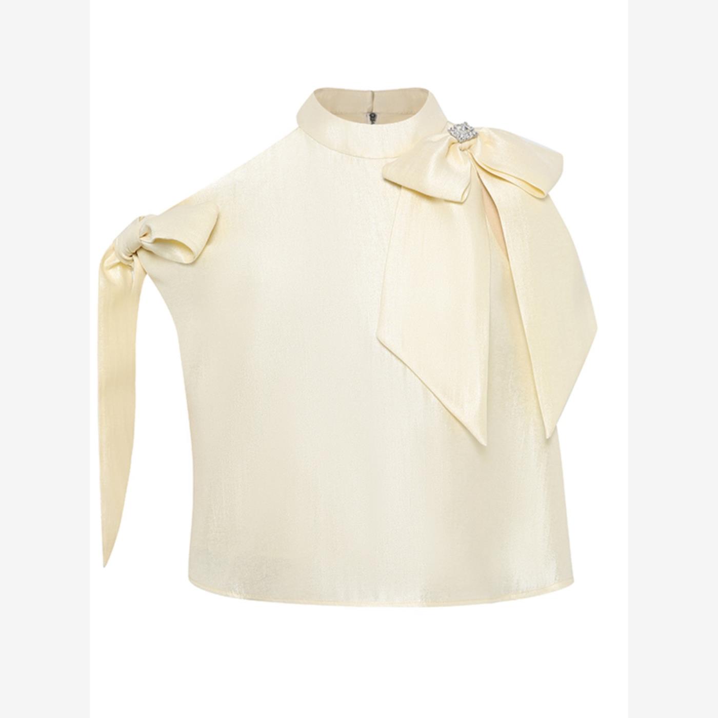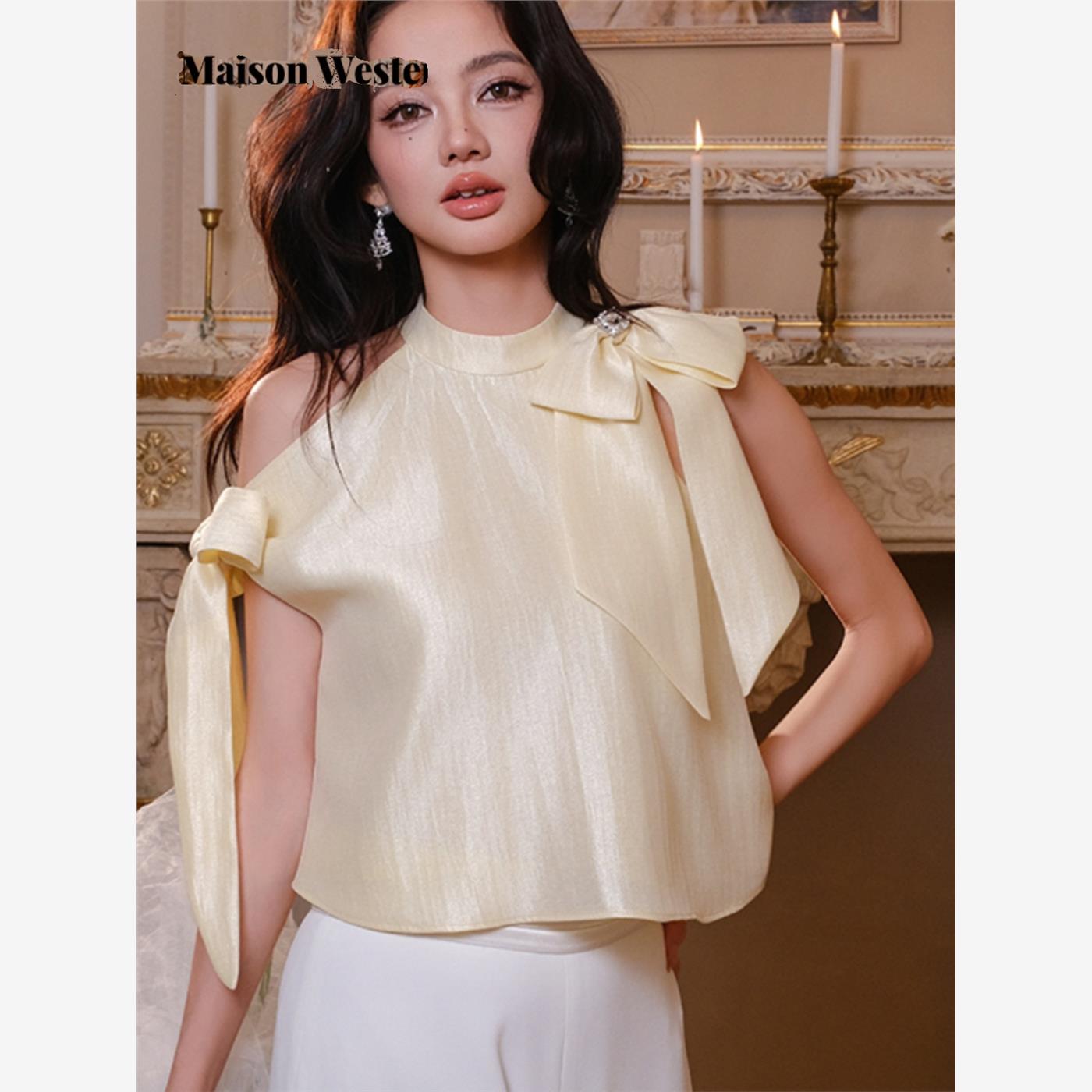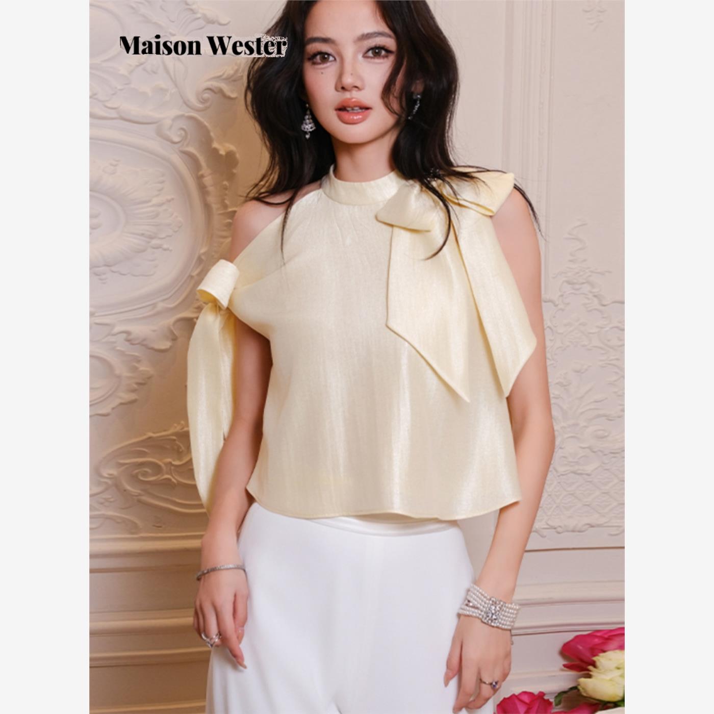 Maison Wester2025年夏季新款夏日独特黄色蝴蝶结露肩飘带上衣