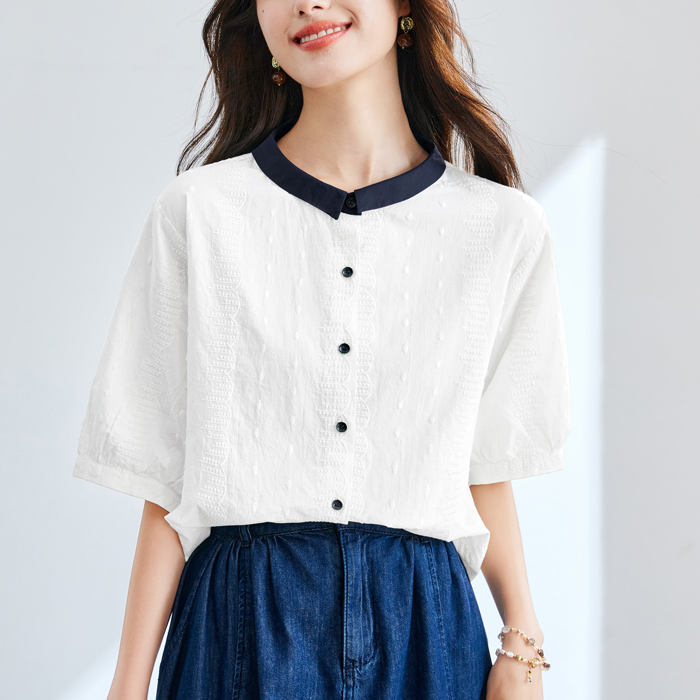 初影立领拼接撞色短袖衬衫