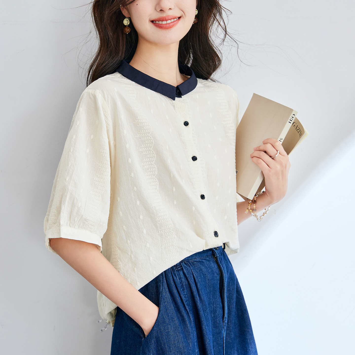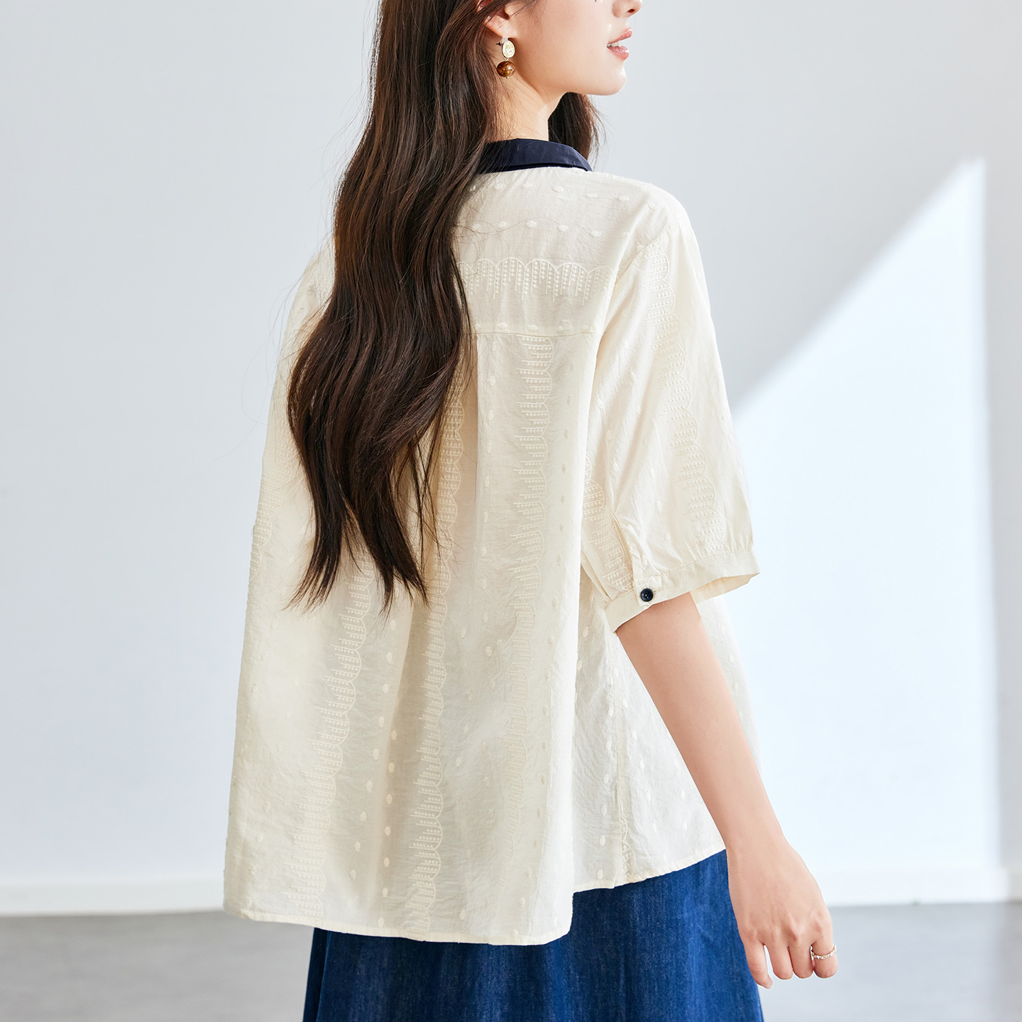 初影 杏色绣花衬衫女短袖2025夏季小方领上衣设计感拼接纯棉衬衣