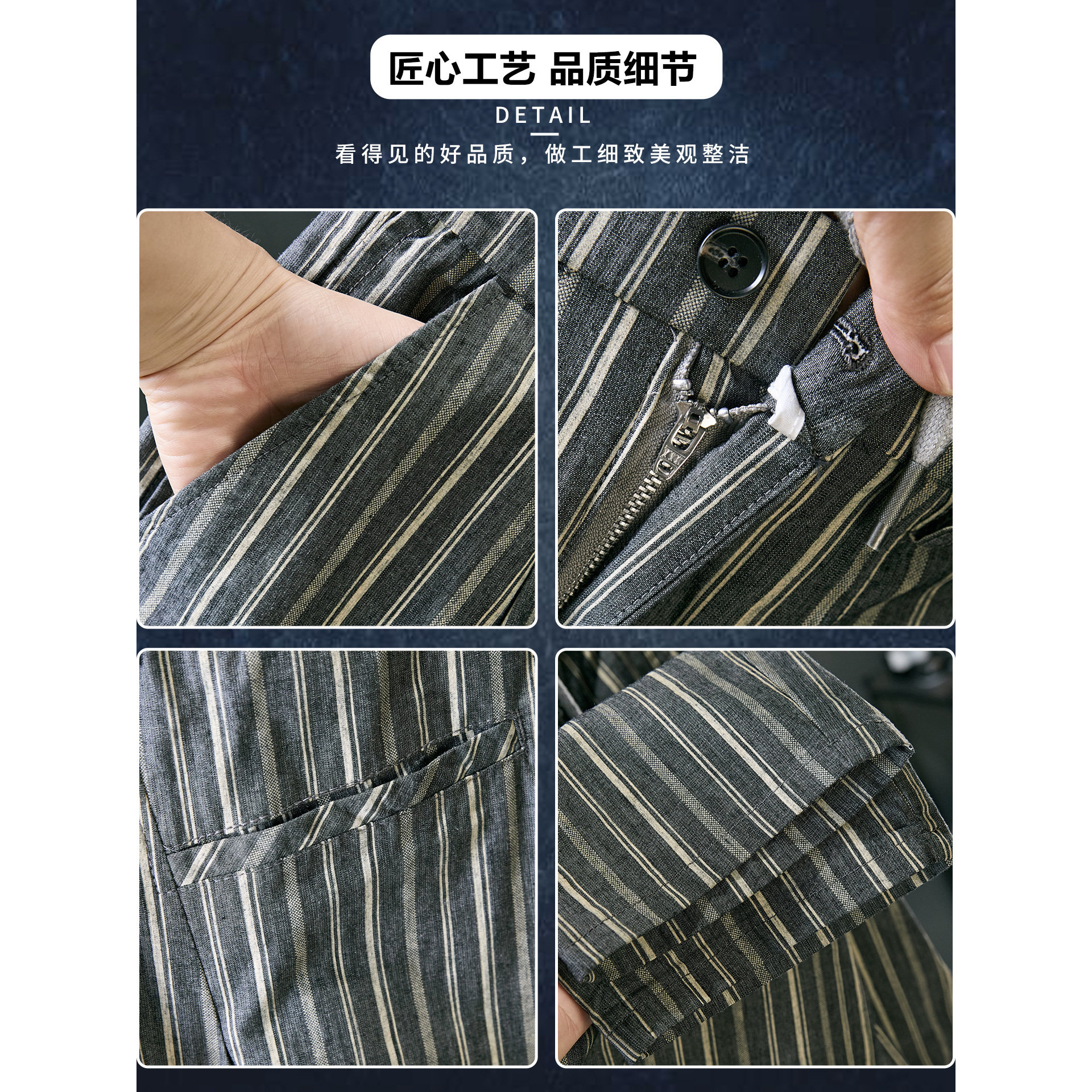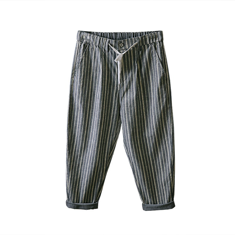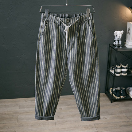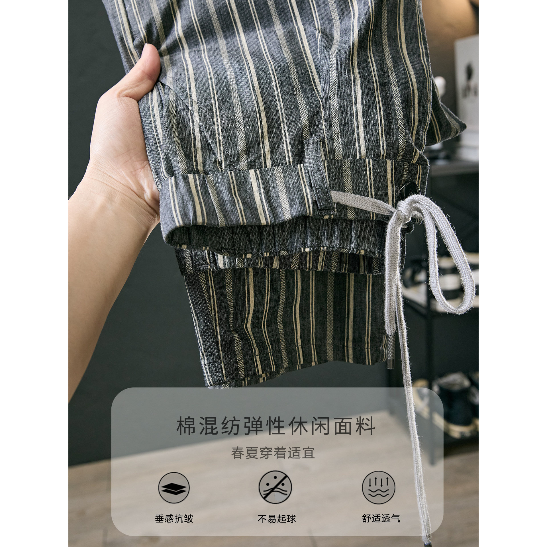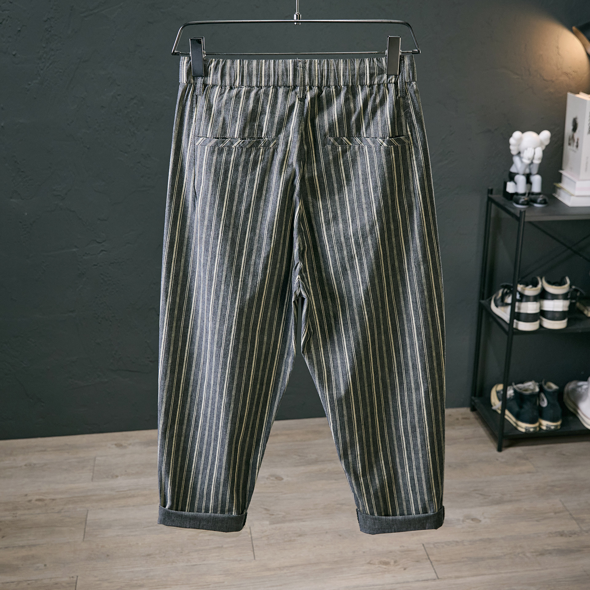 夏季薄款日系竖条纹九分裤男士高端休闲裤 宽松哈伦小直筒9分裤子