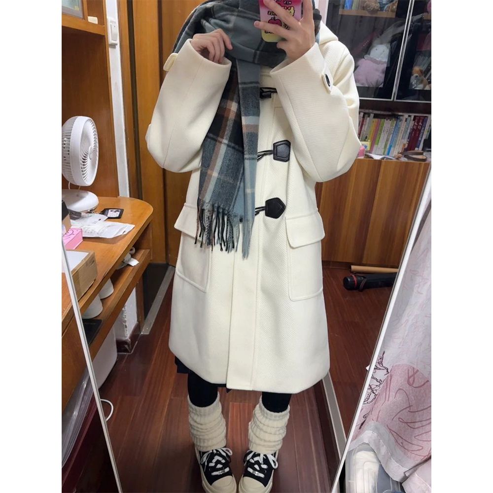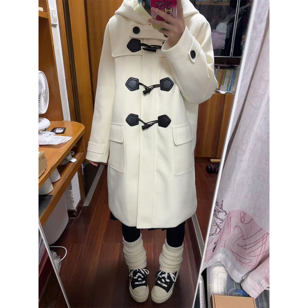 奶油味的冬 JK秋冬牛角扣大衣学院风连帽毛呢外套中长款2024新款
