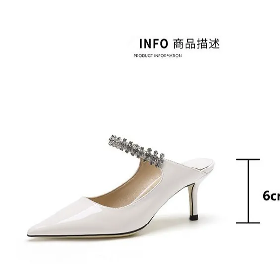 新款夏季水钻漆皮凉鞋女一字带尖头高跟鞋细跟包头半拖平底凉拖鞋