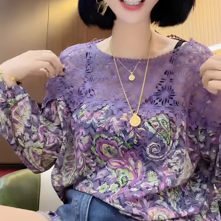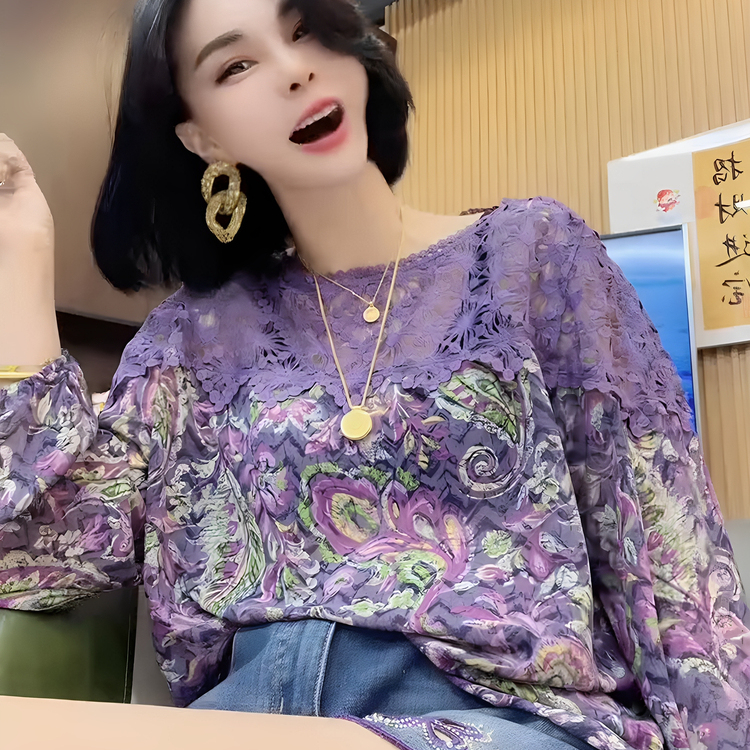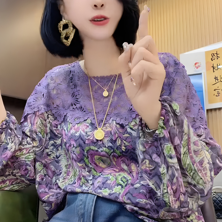 2025夏装新款欧货百搭圆领碎花镂空蕾丝拼接雪纺衫女宽松显瘦小衫