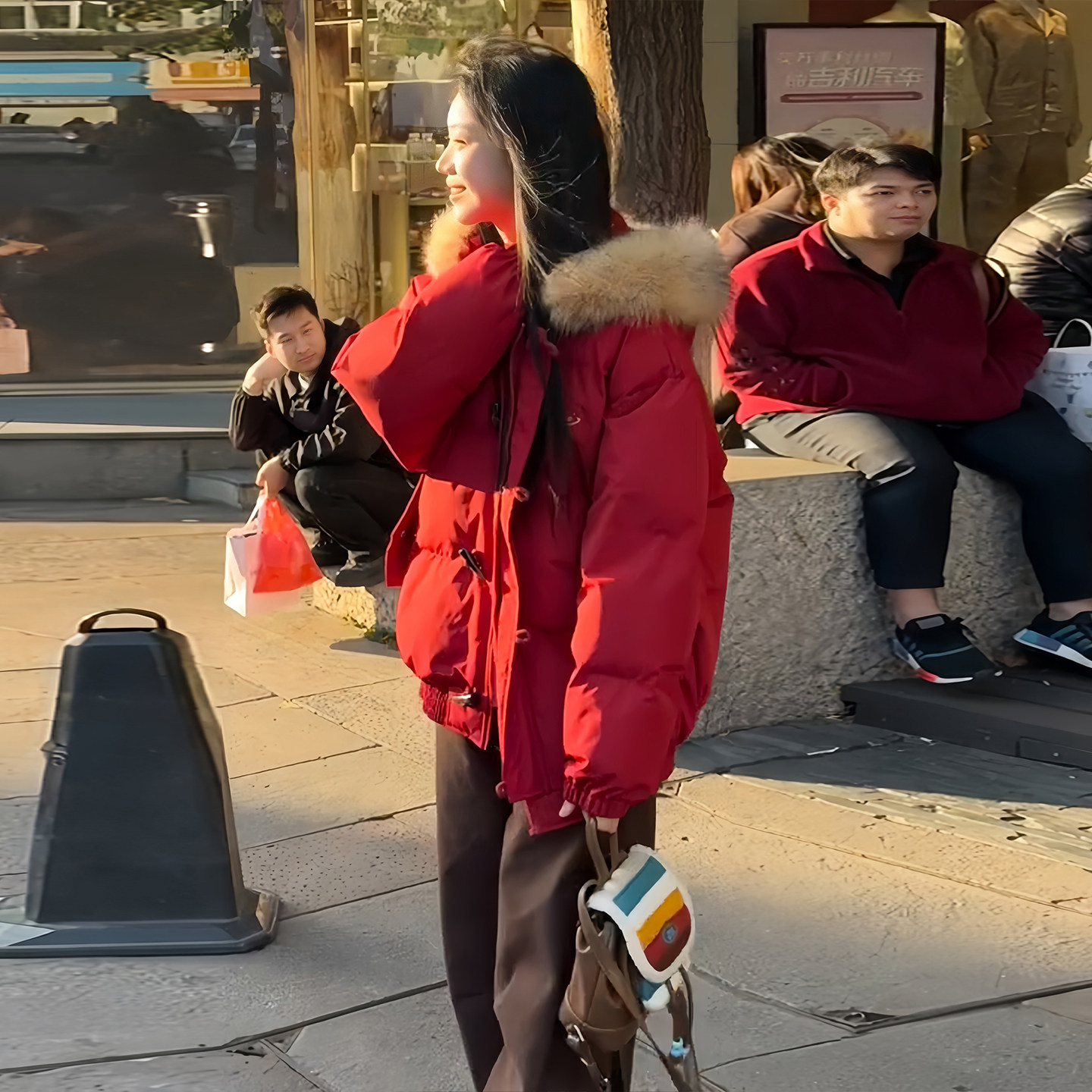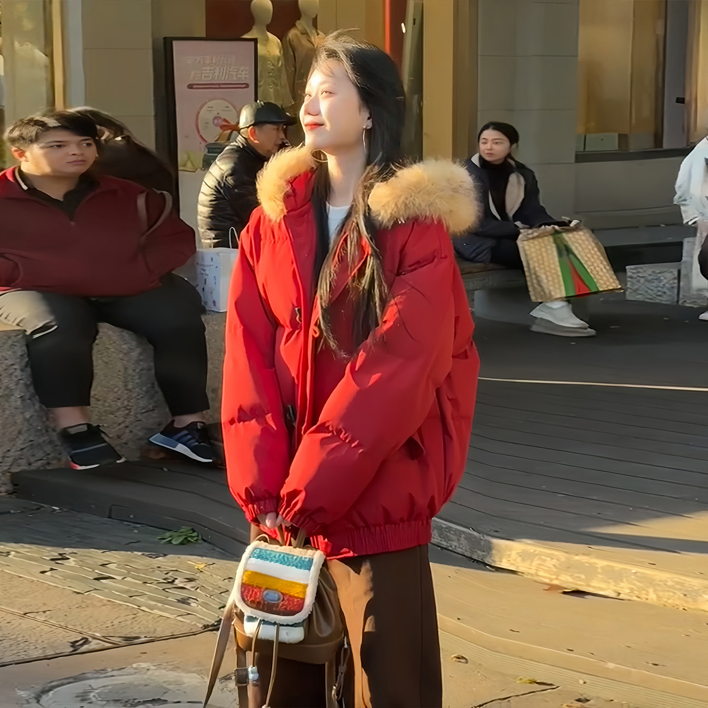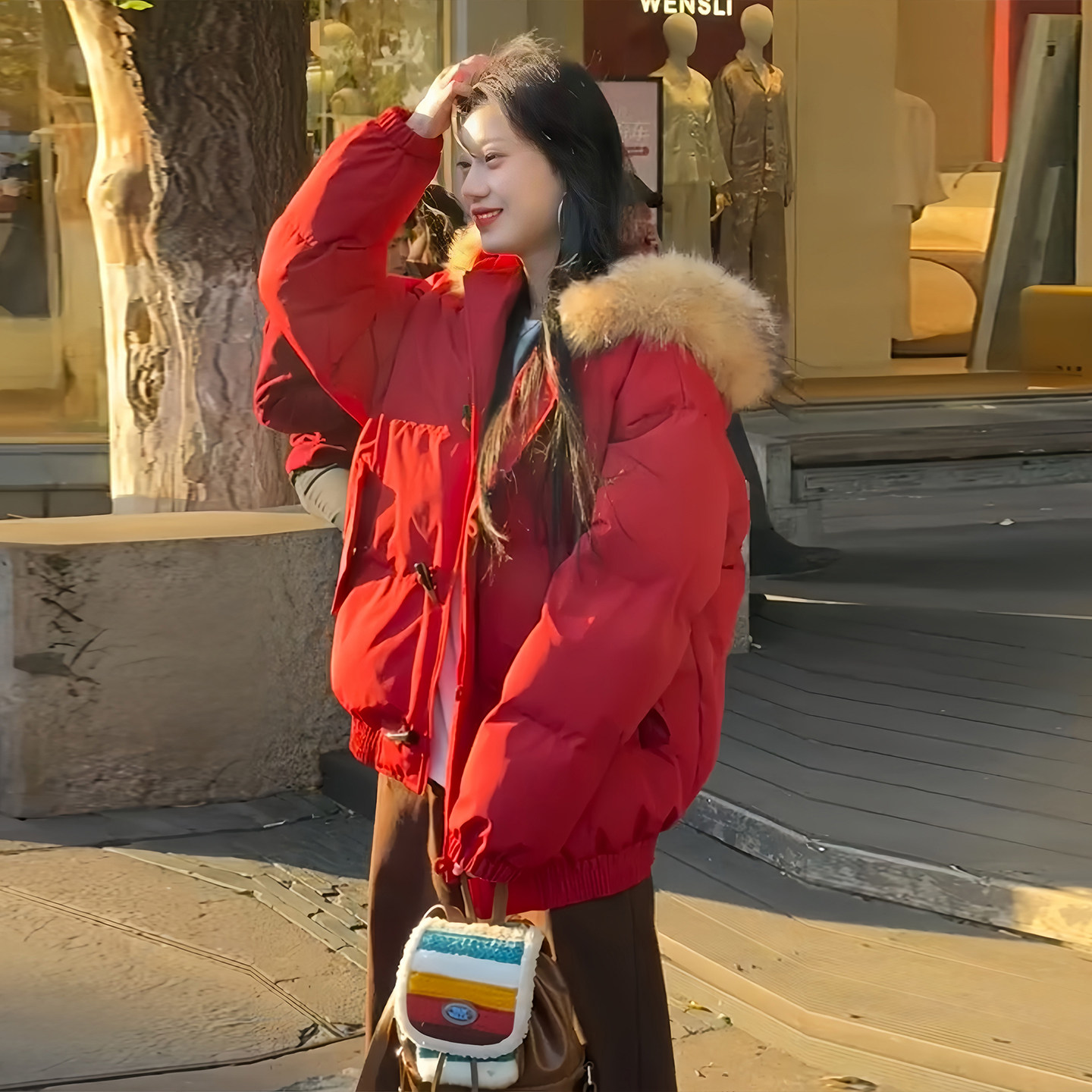 胖mm大码女装红色加厚保暖棉服女冬季通勤百搭高级感连帽棉衣外套
