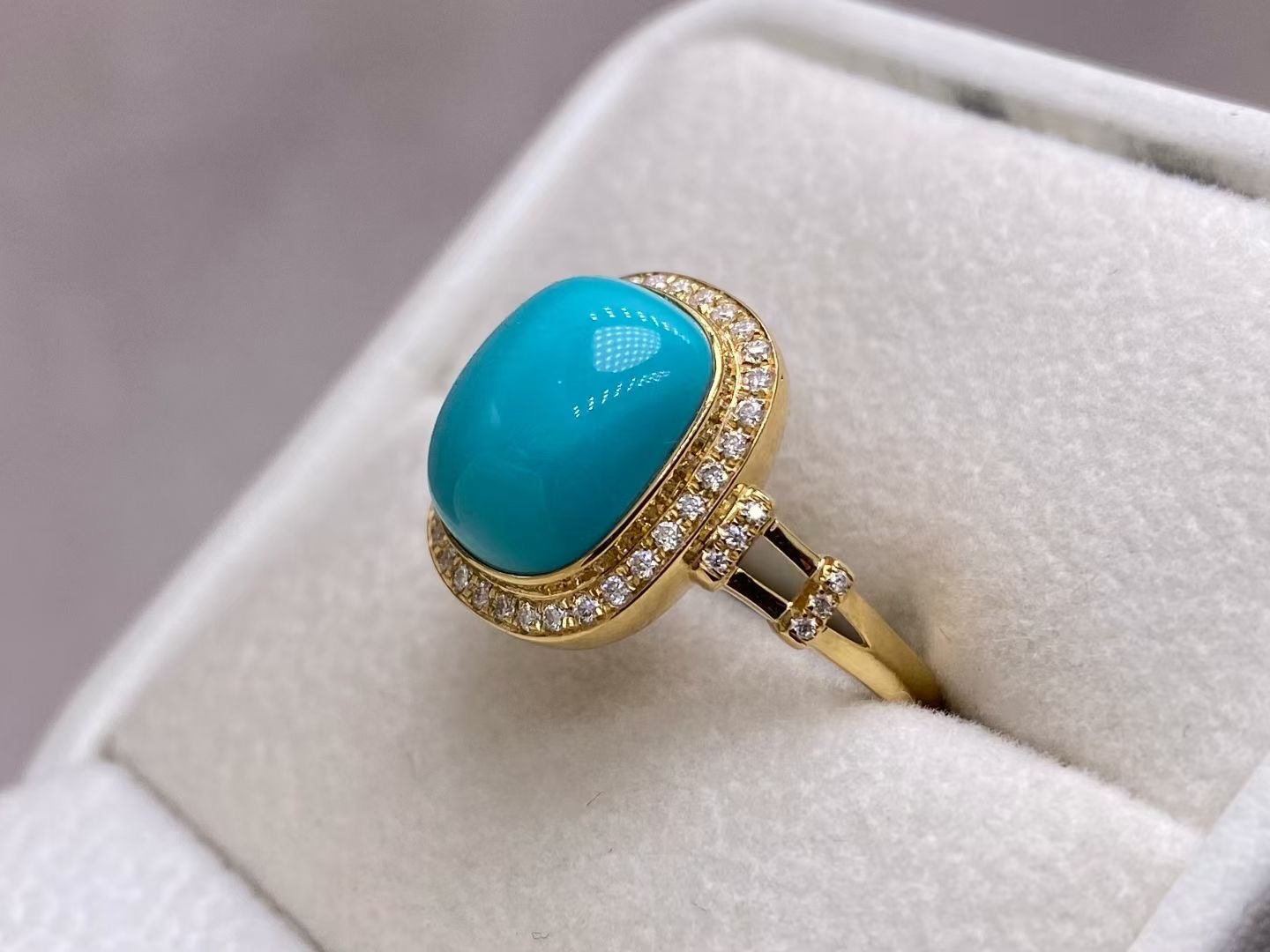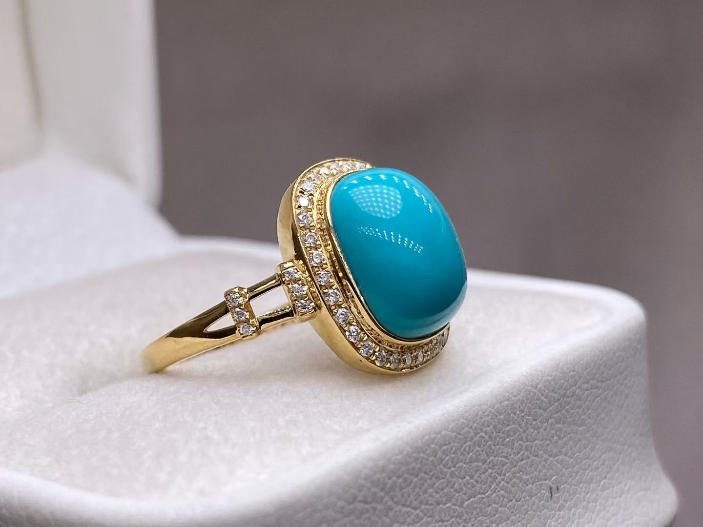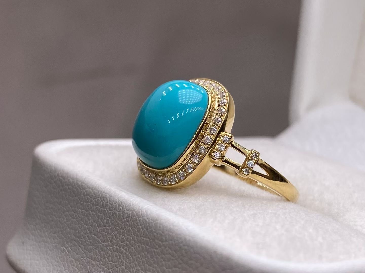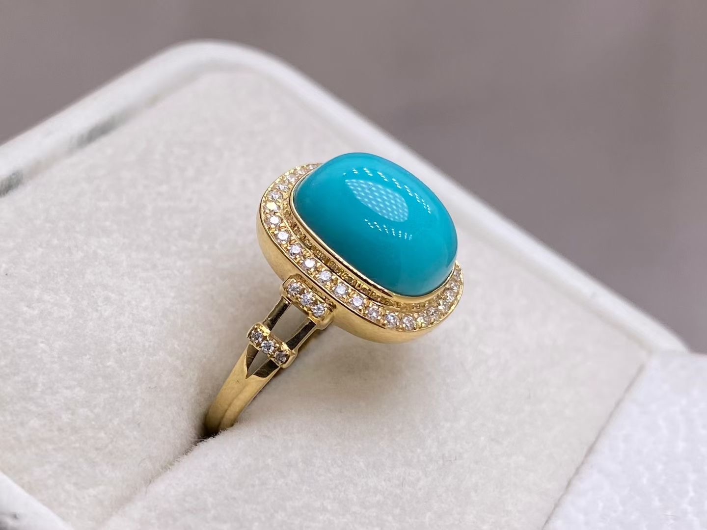 湖北天然原矿绿松石18k金戒指高瓷蓝精品定制款女戒轻奢时尚大气