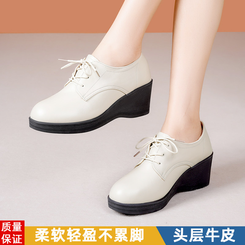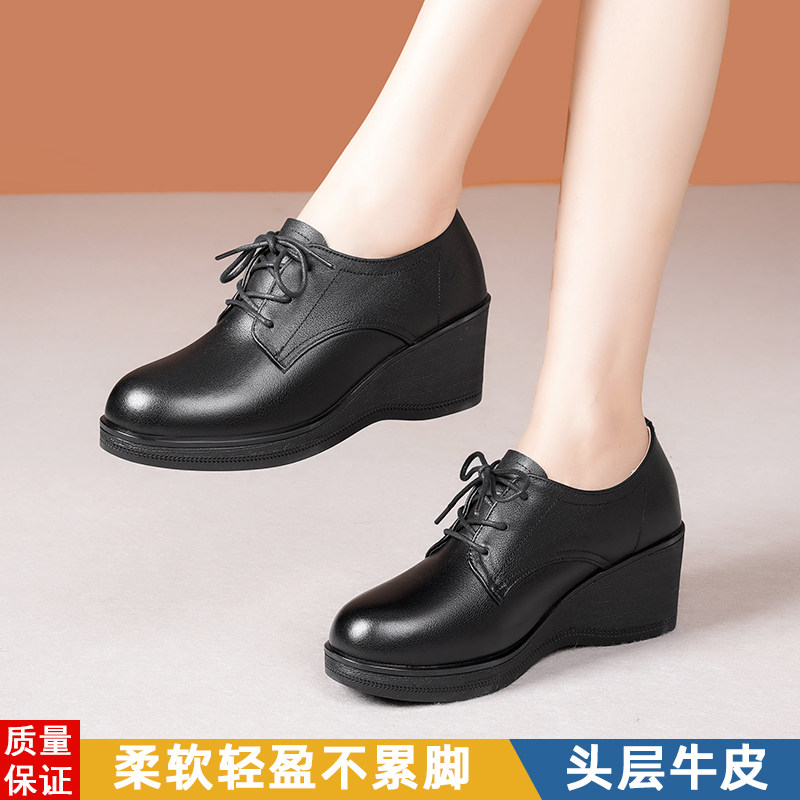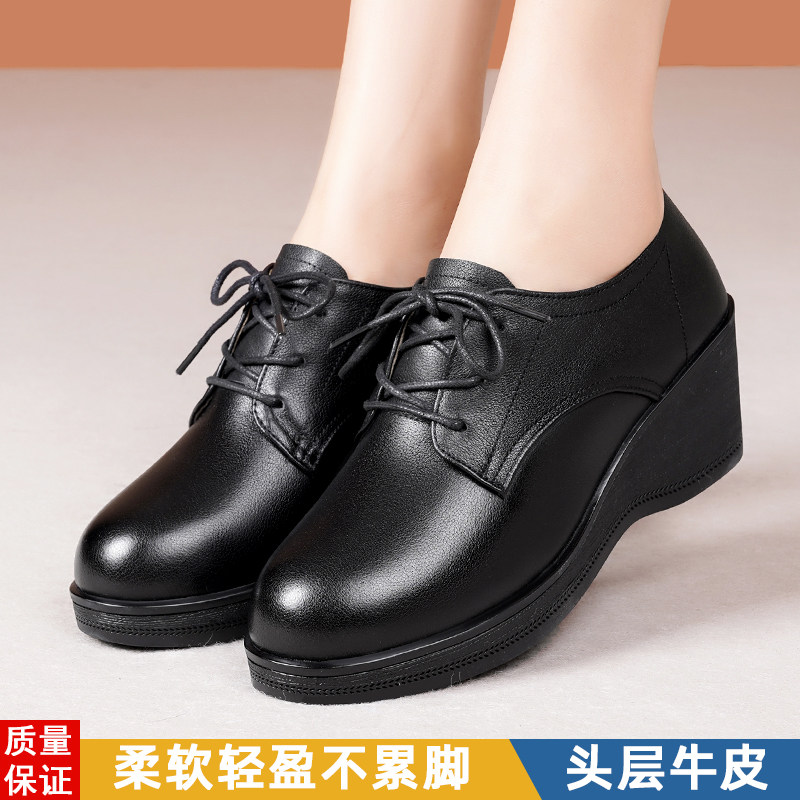 坡跟真皮单鞋厚底高跟软皮系带女式皮鞋中老年妈妈软底不累脚女鞋