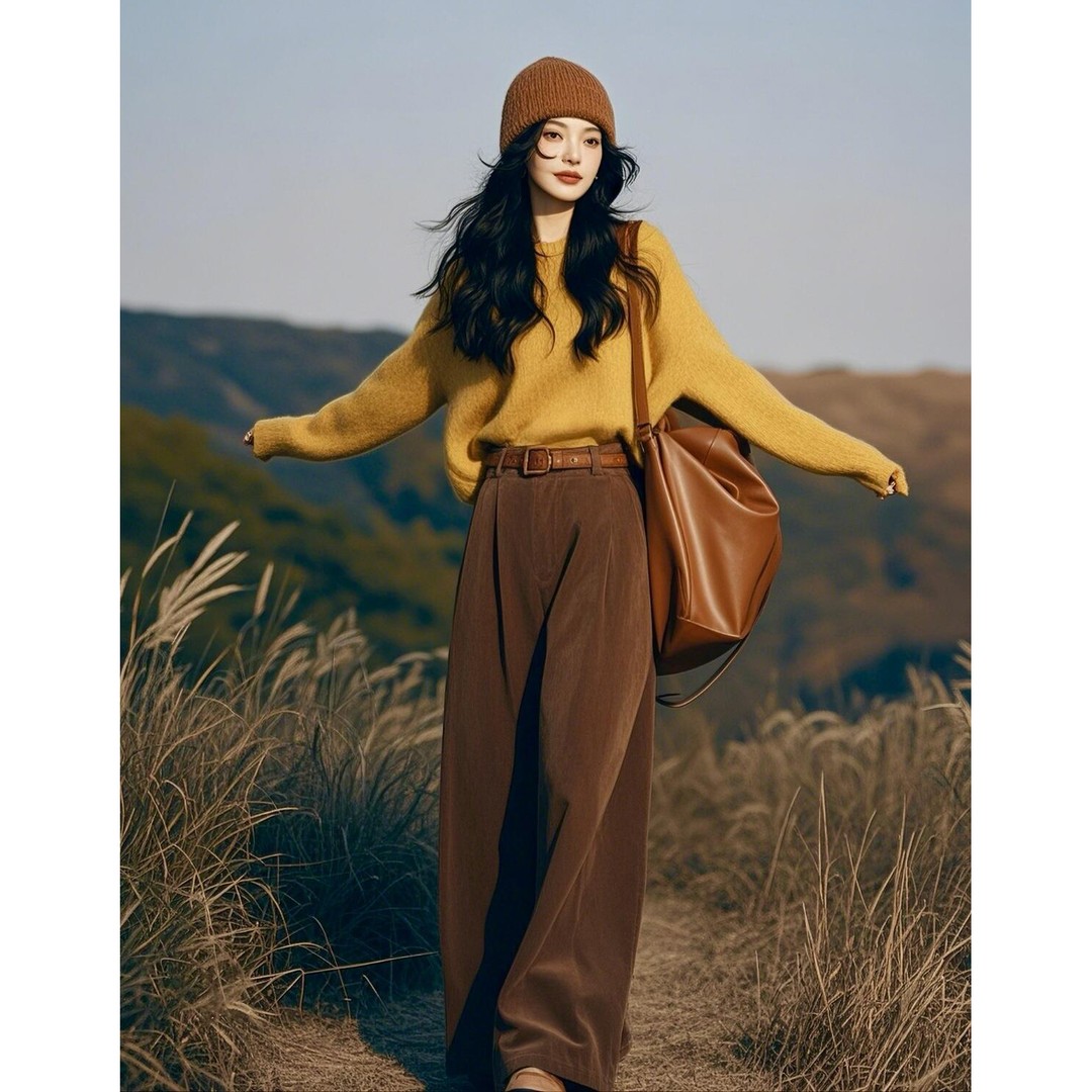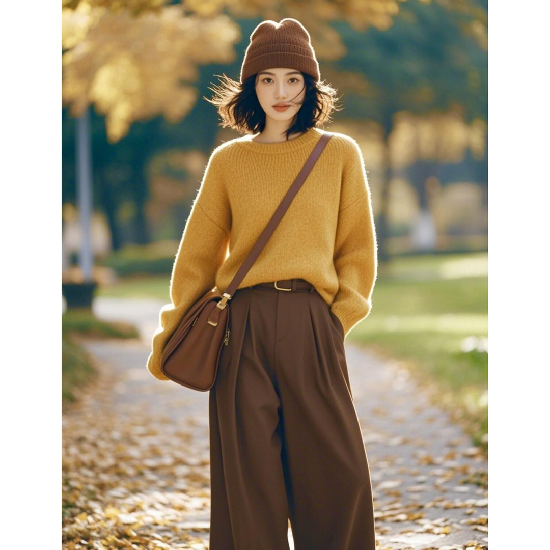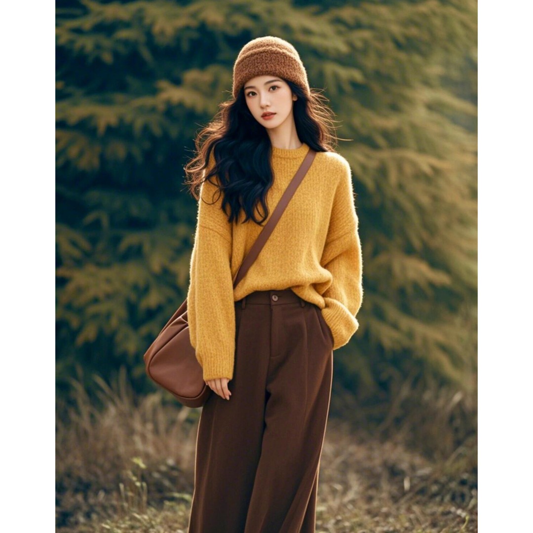入秋一整套女装2025新款韩版复古套头针织毛衣高腰阔腿裤两件套装