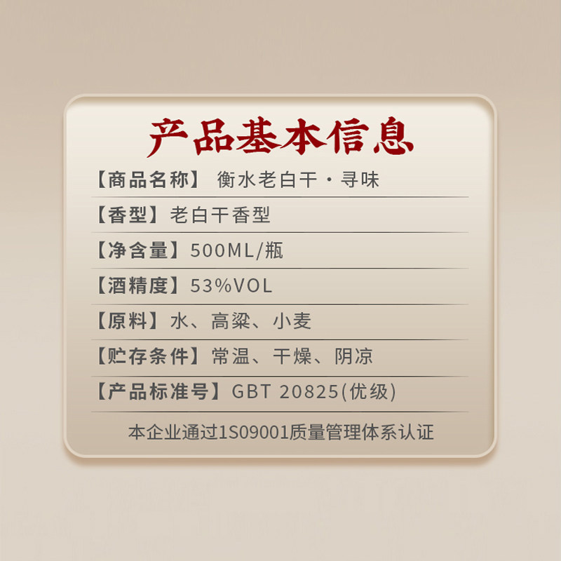 【官方正品】衡水老白干寻味53度500ml单瓶装古法酿造纯粮食白酒
