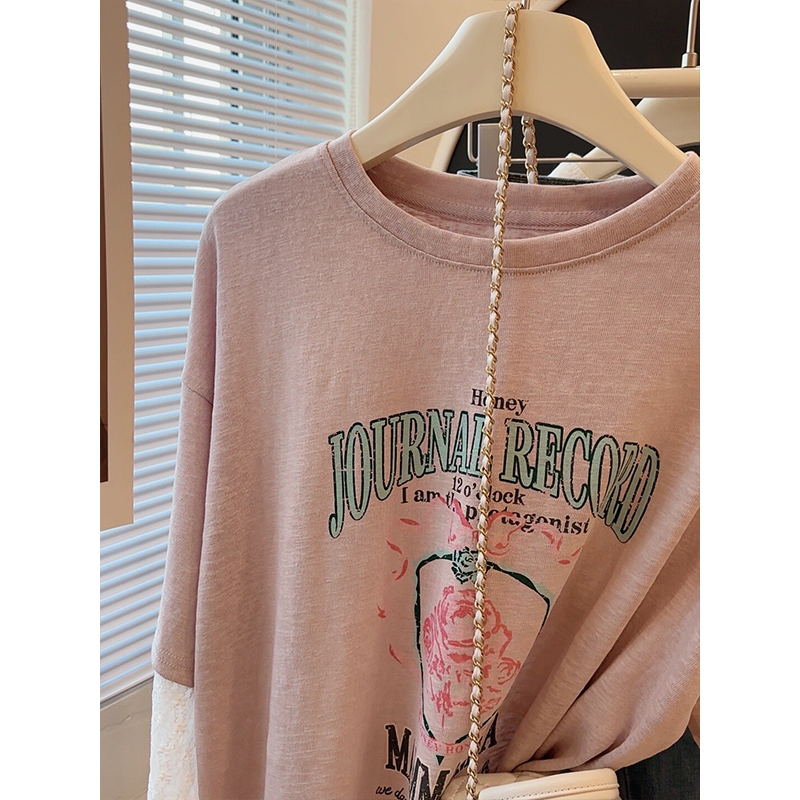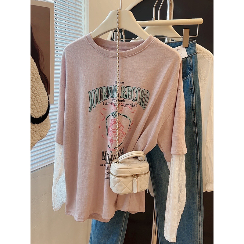 设计感蕾丝拼接假两件长袖防晒t恤女短袖夏宽松chic港味洋气上衣