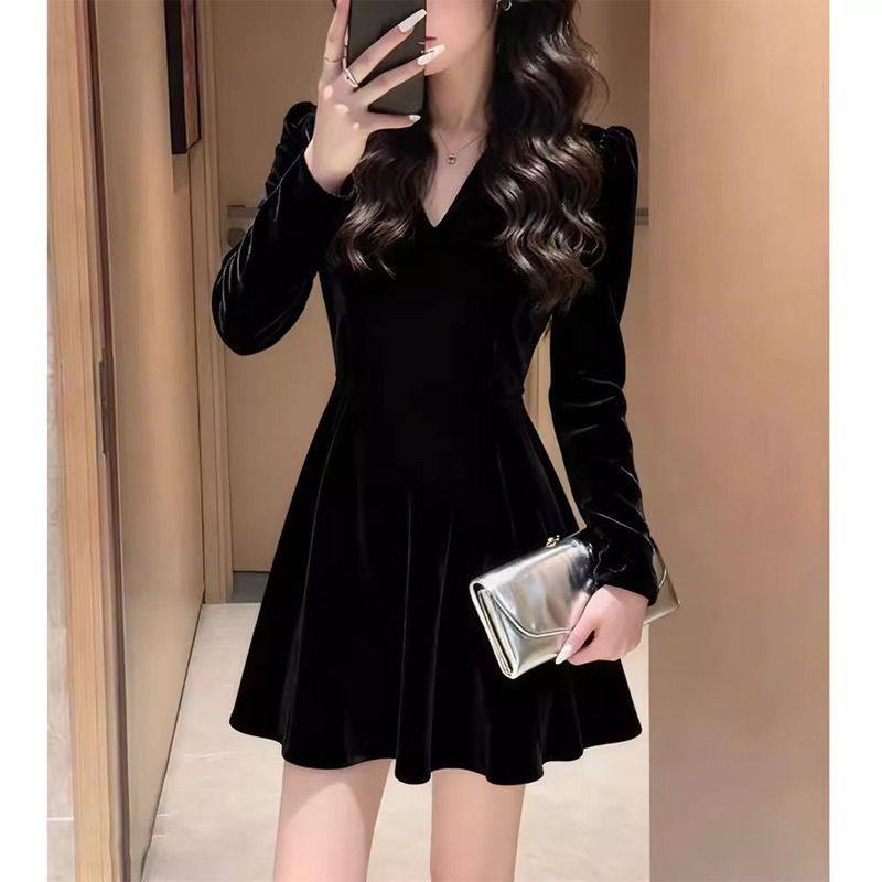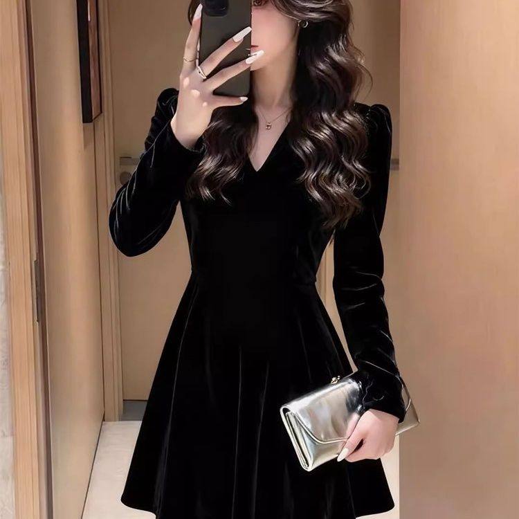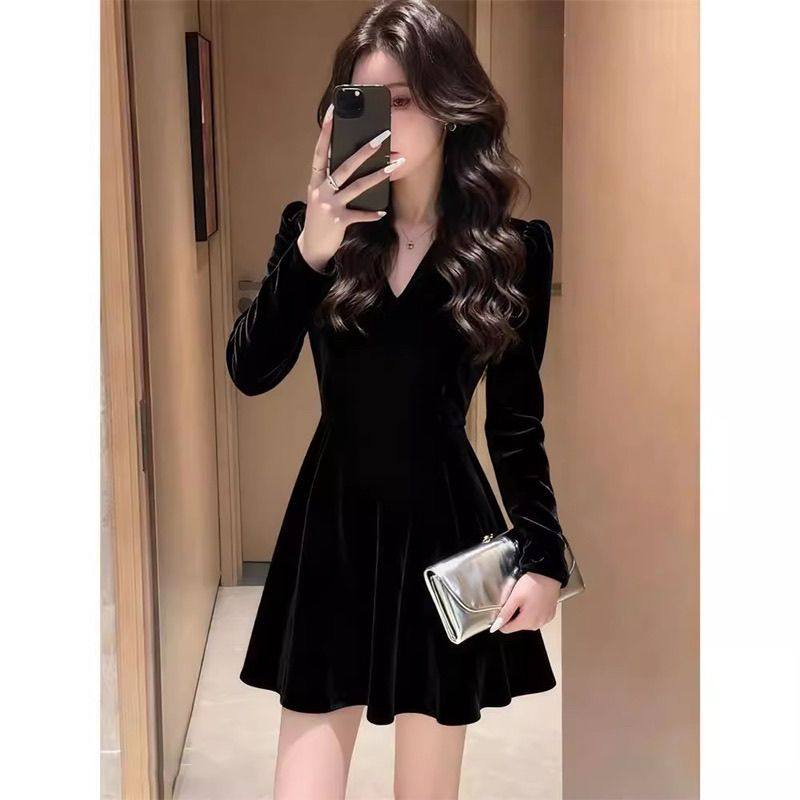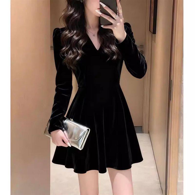 2025新款赫本风丝绒连衣裙黑色V领泡泡袖收腰修身小黑裙气质名媛