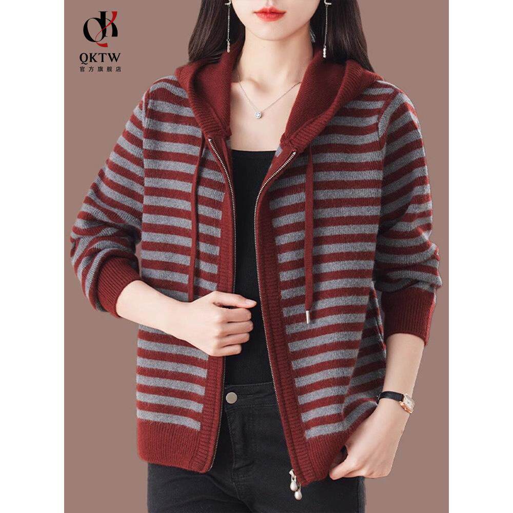 鄂尔多斯市毛衣外套女2025秋冬新款圆领气质条纹显瘦拉炼针织开衫