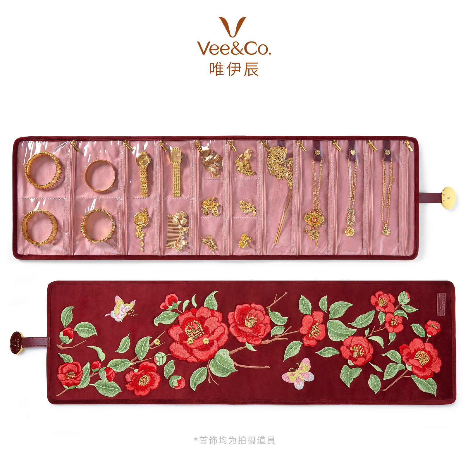 唯伊辰新品国风丝绒山茶花刺绣便携黄金收纳首饰包高档结婚礼物盒