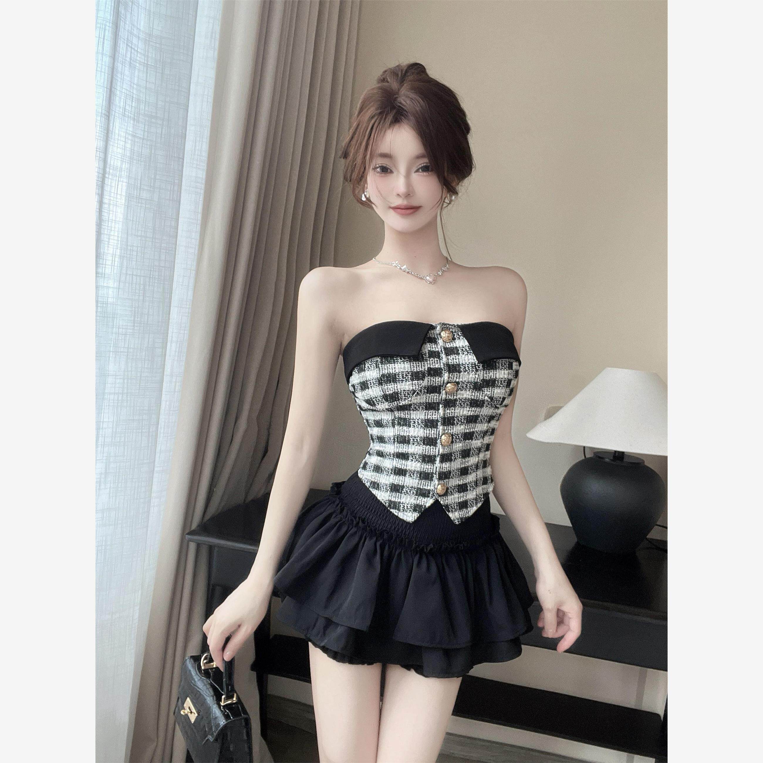 小香风辣妹套装女法式抹胸背心蓬蓬半身短裙子夏季新款时尚两件套