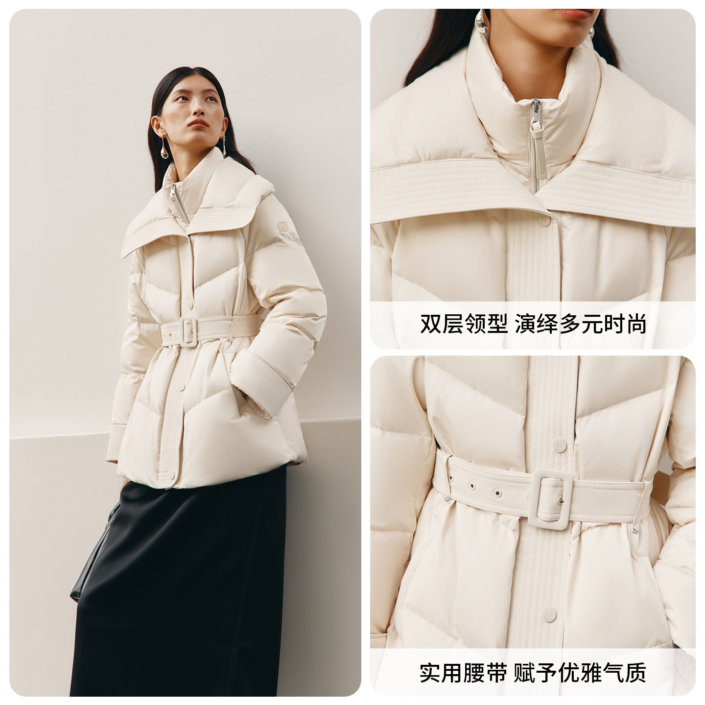 艾莱依御风系列鹅绒羽绒服高级时尚可拆卸腰带新款气质女短款外套