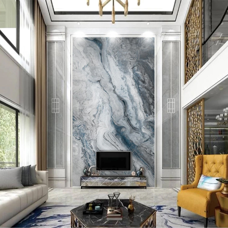别墅电视背景墙岩板简约大理石纹壁画客厅中空复式楼瓷砖影视壁砖