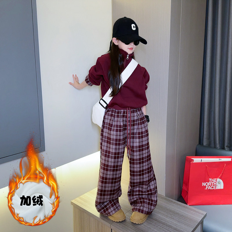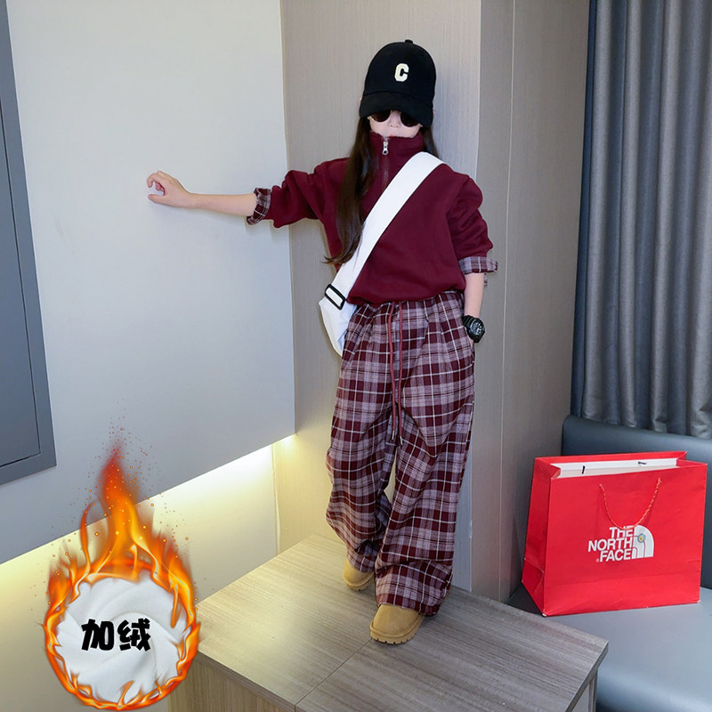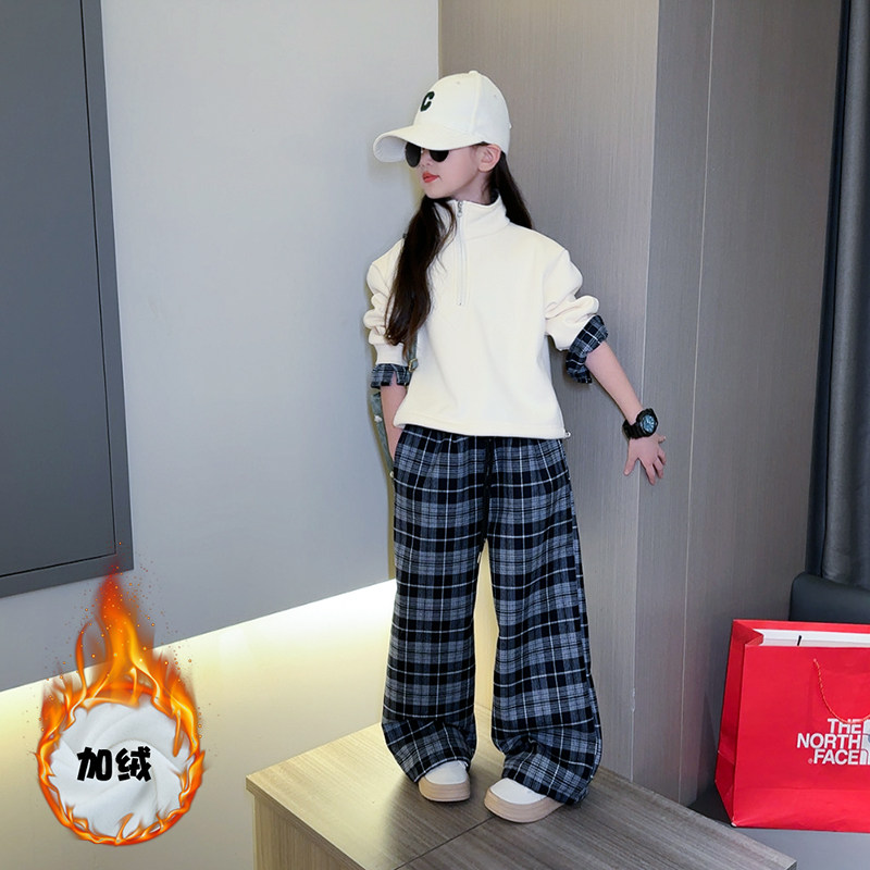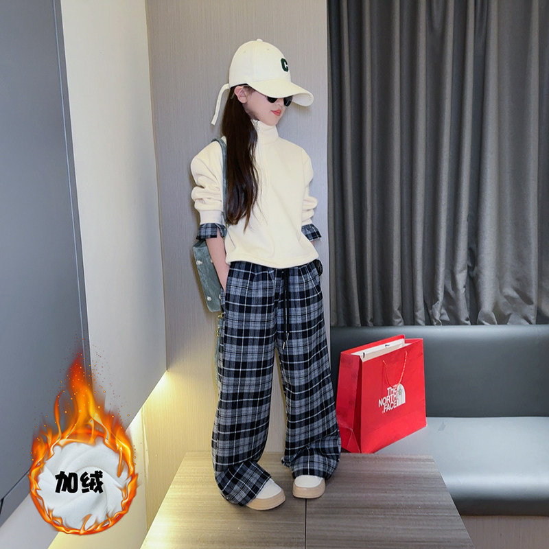 女童秋冬休闲套装2025新款儿童韩版加绒卫衣格子裤运动洋气两件套