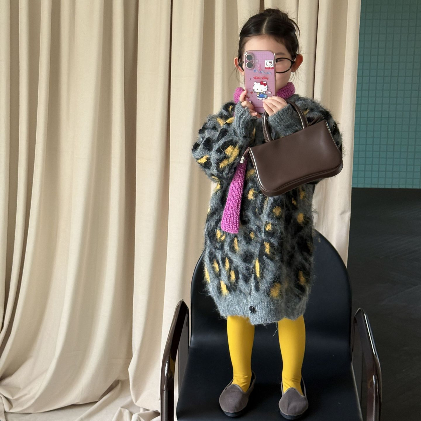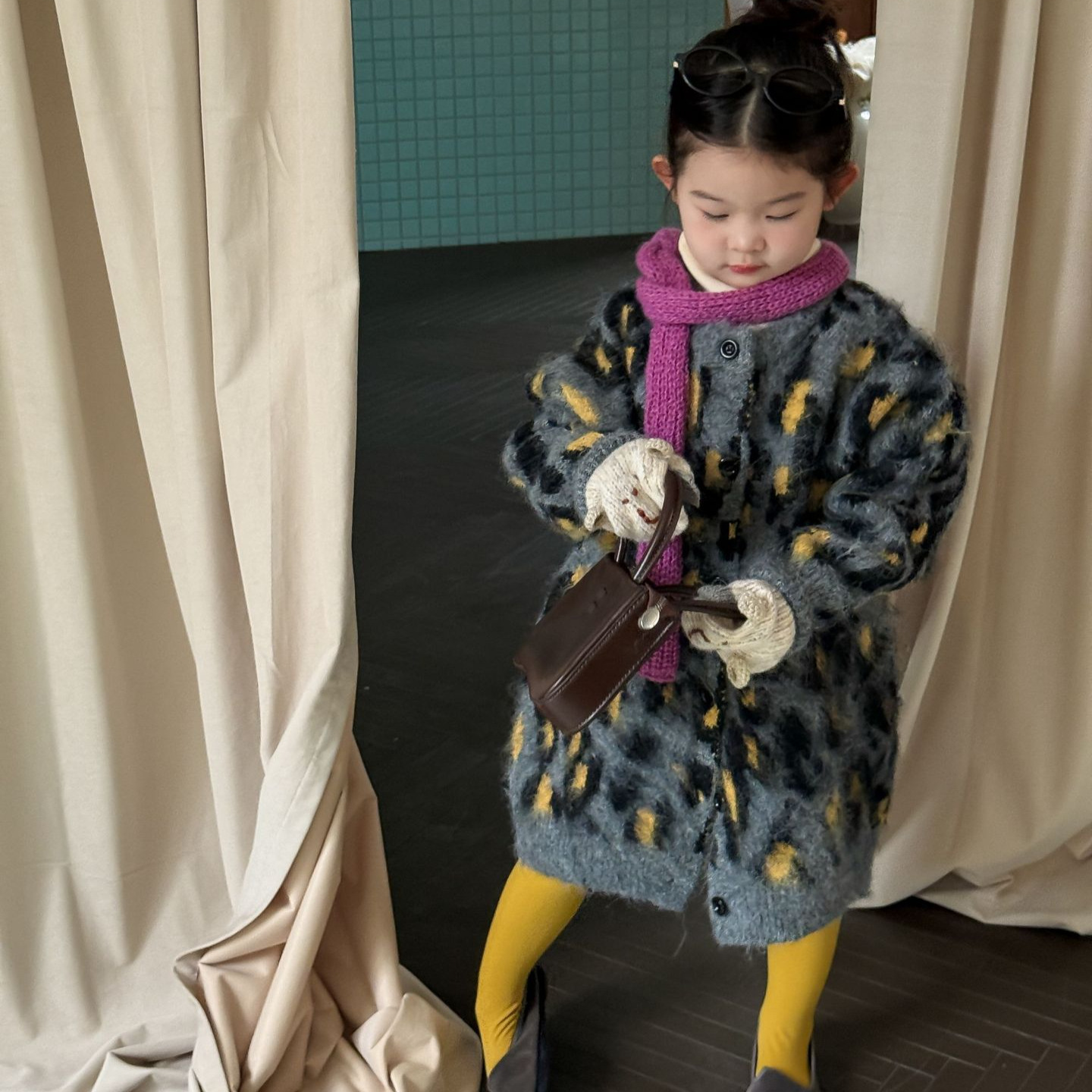 2025冬季新款童装 韩版童装 女童超厚实针织豹纹毛衣开衫 中长款