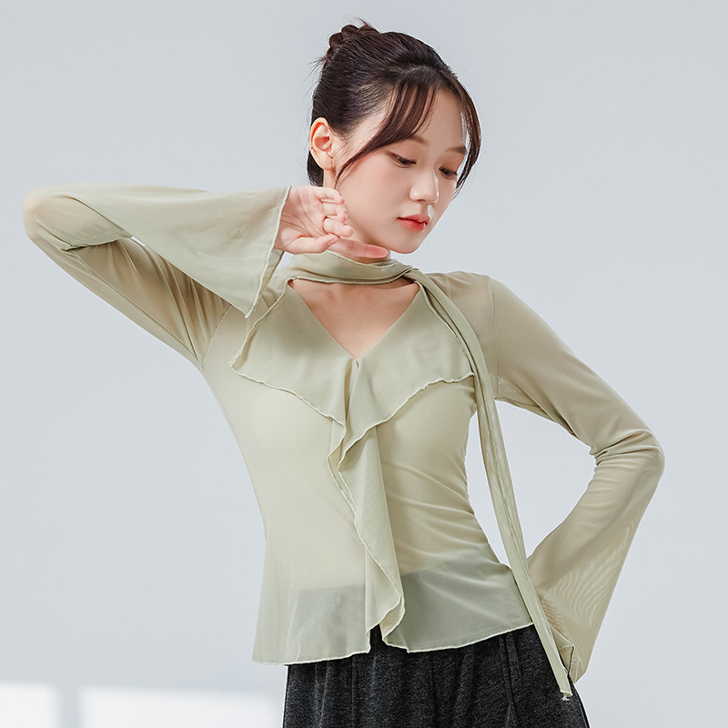古典舞蹈练功服女荷叶飘带网纱长袖上衣中国舞形体飘逸日常练功服