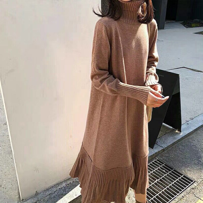 加厚套头高领毛衣裙配大衣连衣裙时尚港风宽松过膝拼接大摆长裙潮