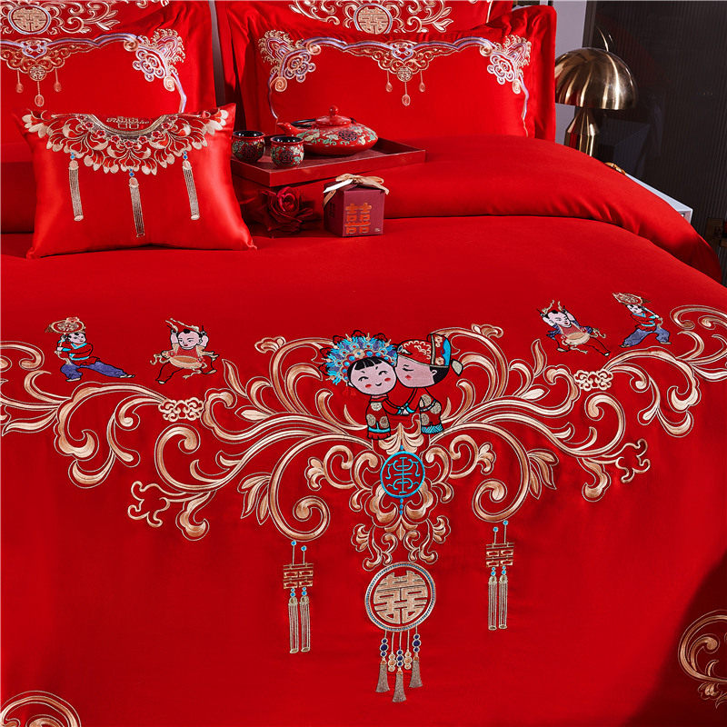 结婚床上用品四件套新婚喜字被套红色婚庆床单婚R嫁子孙图婚床刺