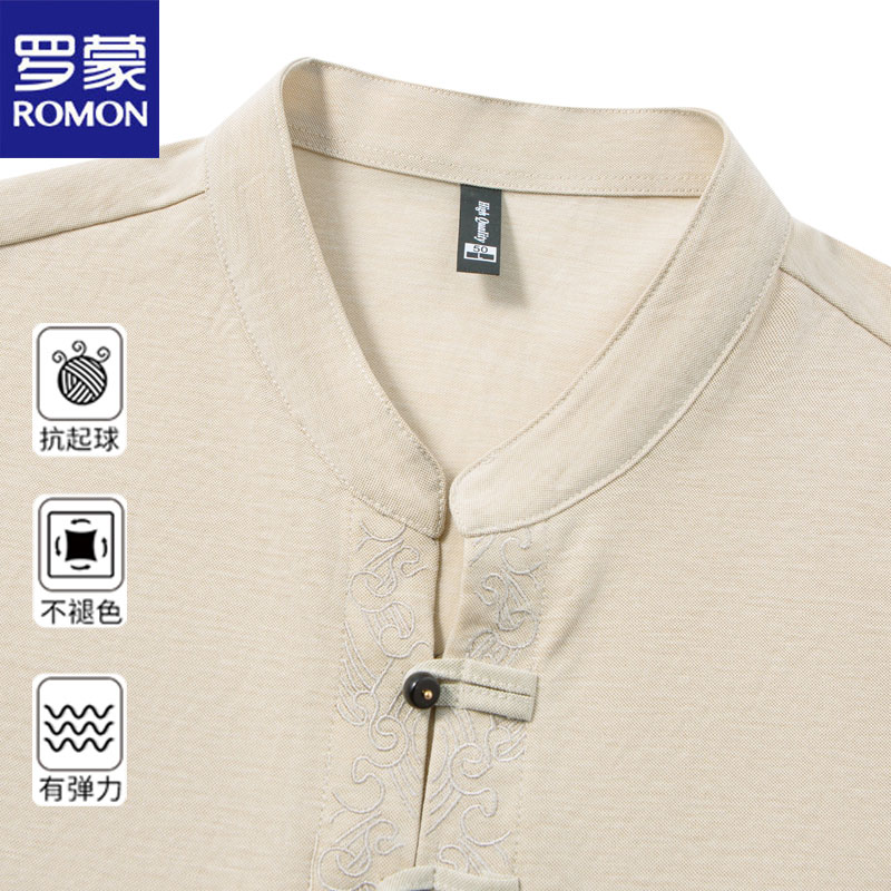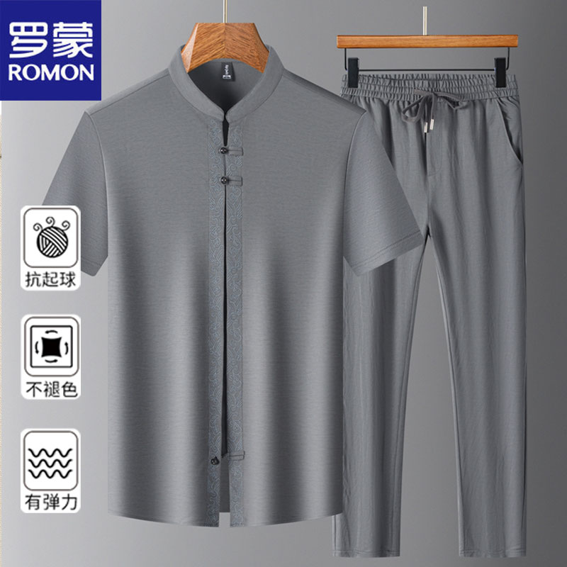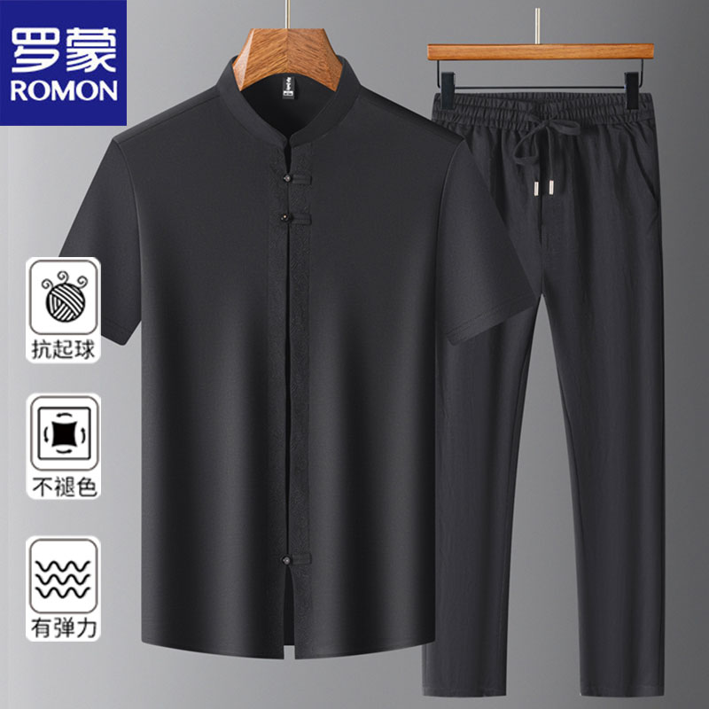 罗蒙新款中国风短袖衬衫套装男士唐装盘扣休闲清凉感高端复古上衣