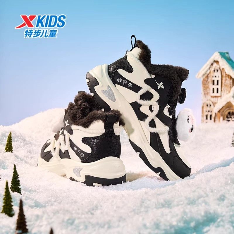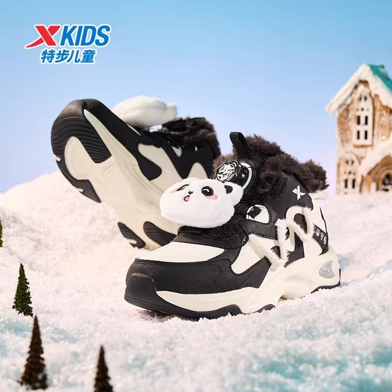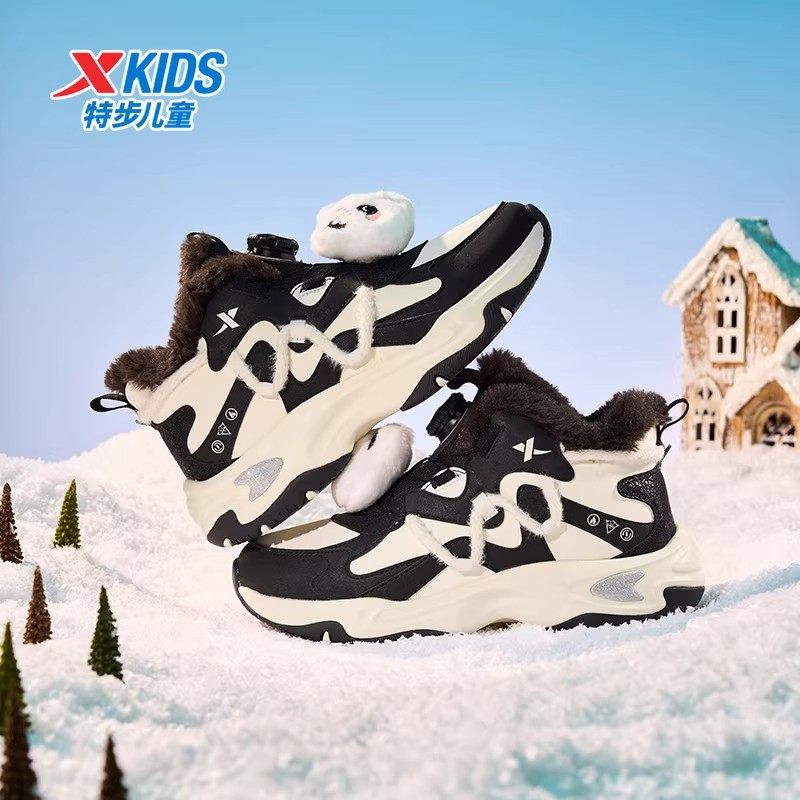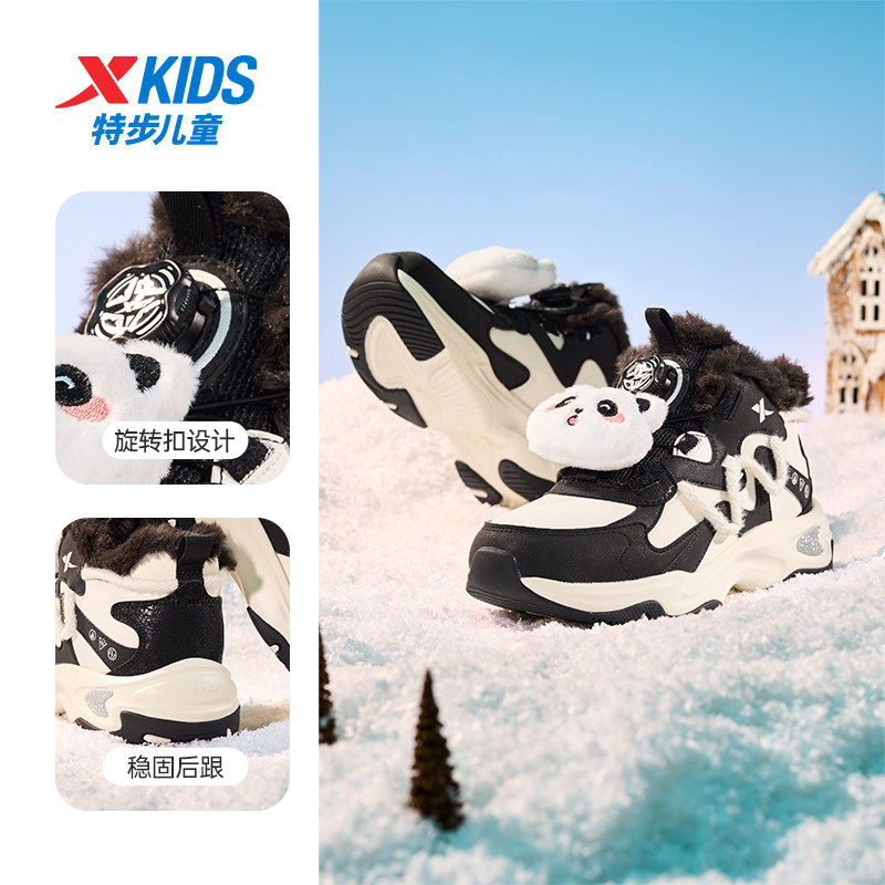 【舒适大棉】特步童鞋2025冬季男女可爱棉鞋防滑旋钮扣加绒运动鞋