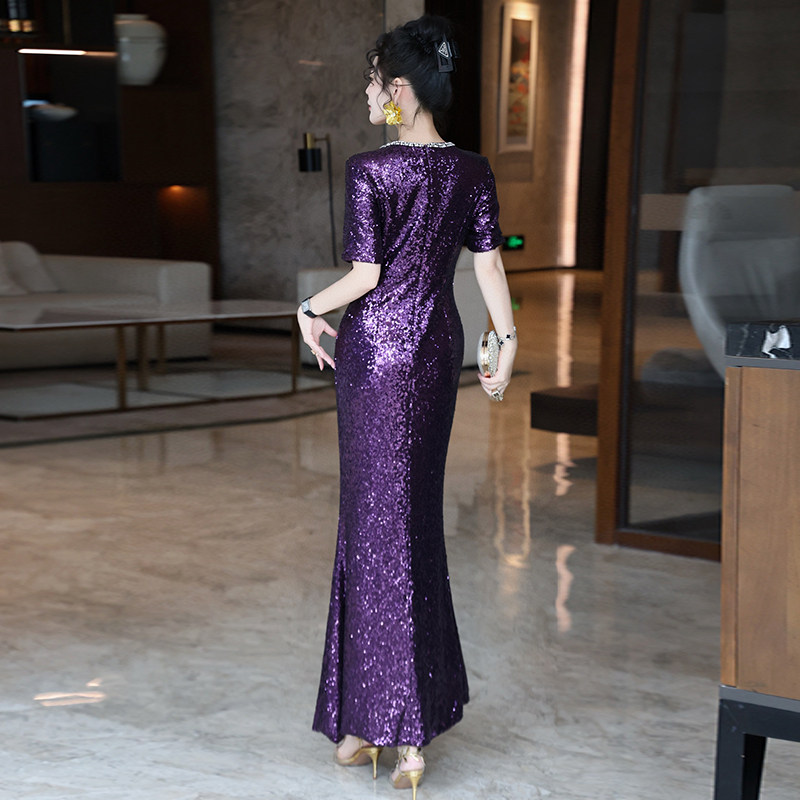 高端婚礼宴会礼服裙修身包臀亮片鱼尾长裙喜妈妈喜婆婆珠光连衣裙