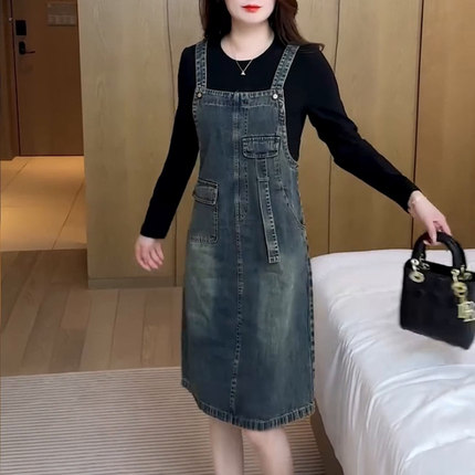 大码气质牛仔背带裙2025春秋新款显瘦宽松时尚减龄遮肚洋气连衣裙