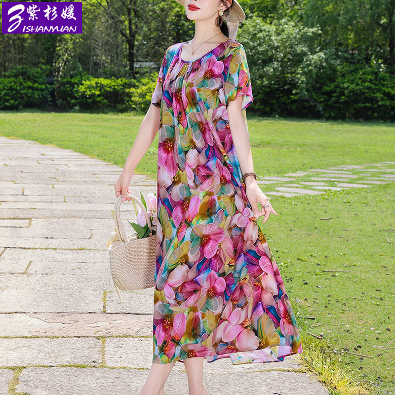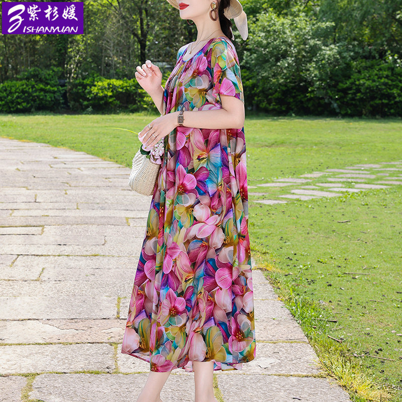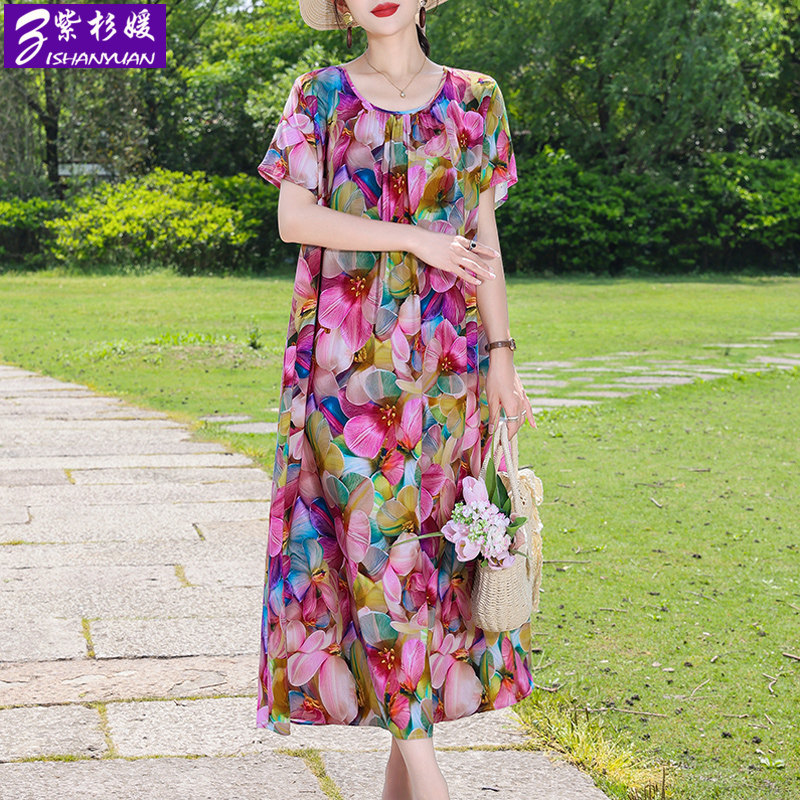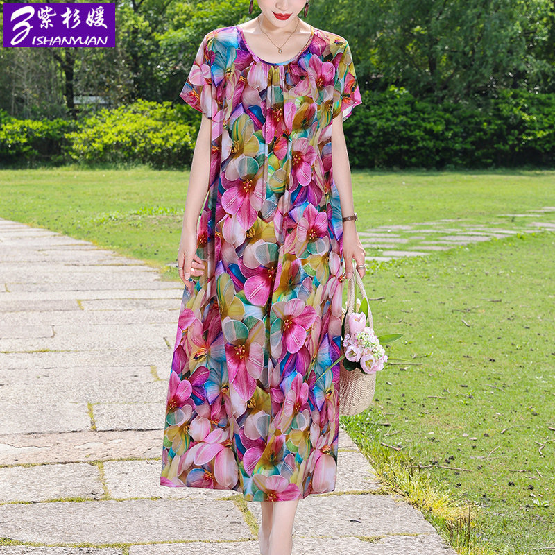 大花棉绸连衣裙长裙过膝中老年女装妈妈夏季新款人造棉宽松大码裙