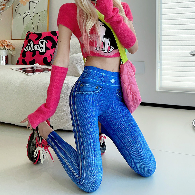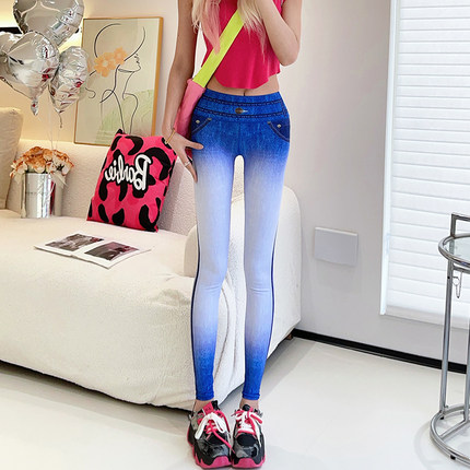 瑜伽裤女春秋薄款2025新款外穿仿牛仔印花九分小脚运动健身打底裤