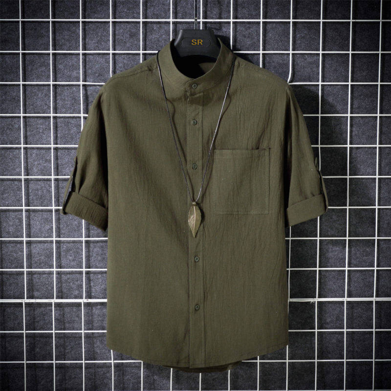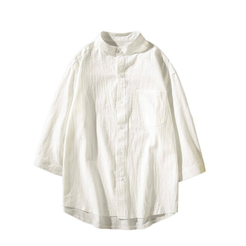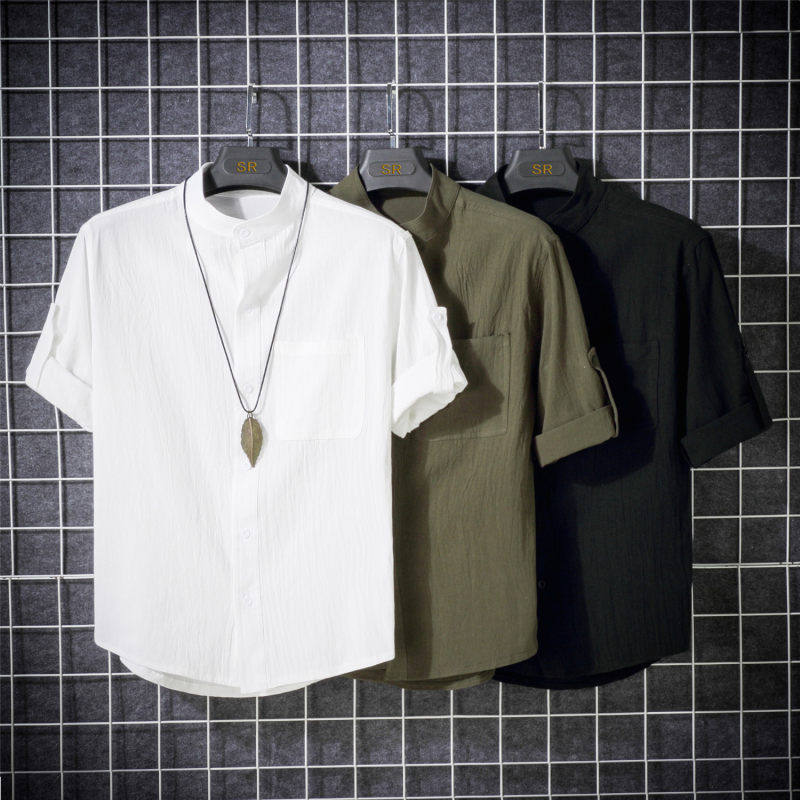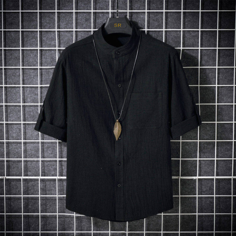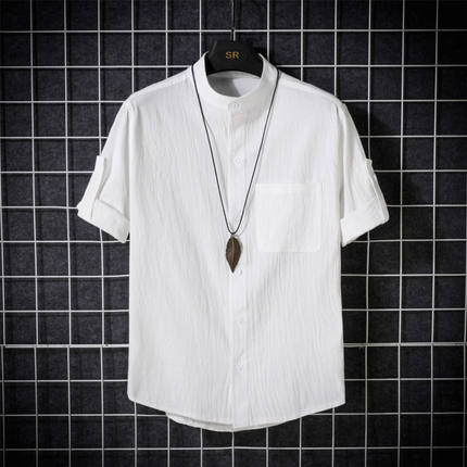 新中式轻国风大号亚麻衬衫男款春夏V领衬衣棉麻中山装短袖T恤上衣