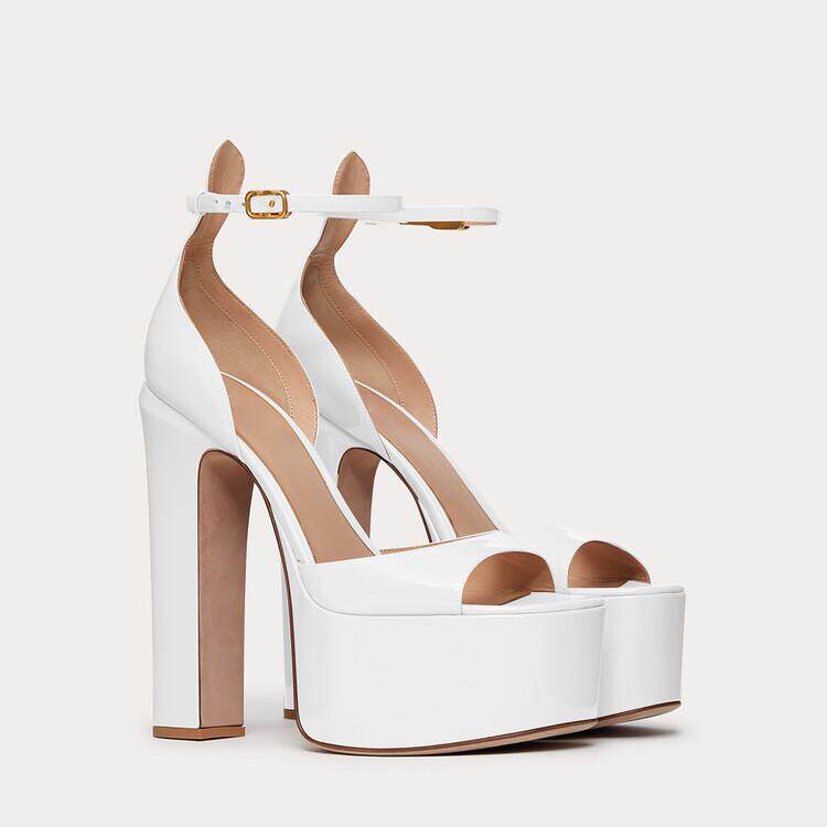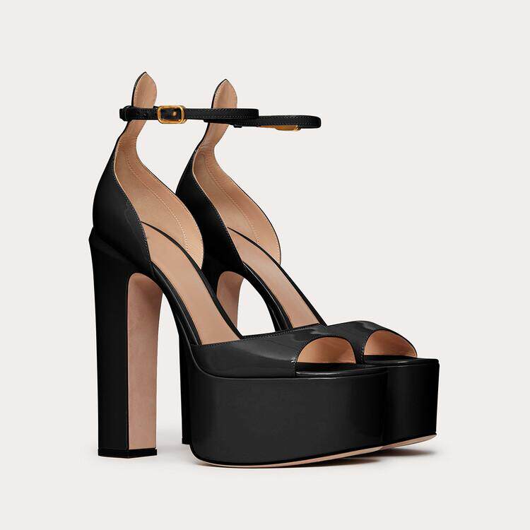 欧美方头粗跟露趾高跟凉鞋真皮女漆皮鱼嘴鞋脚环绑带防水台职业潮