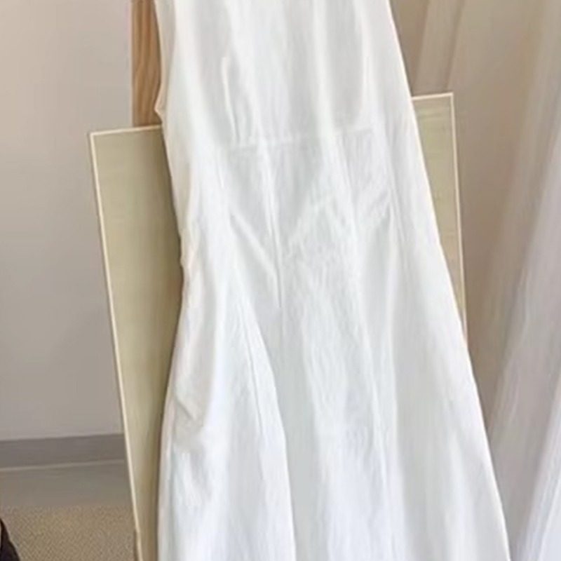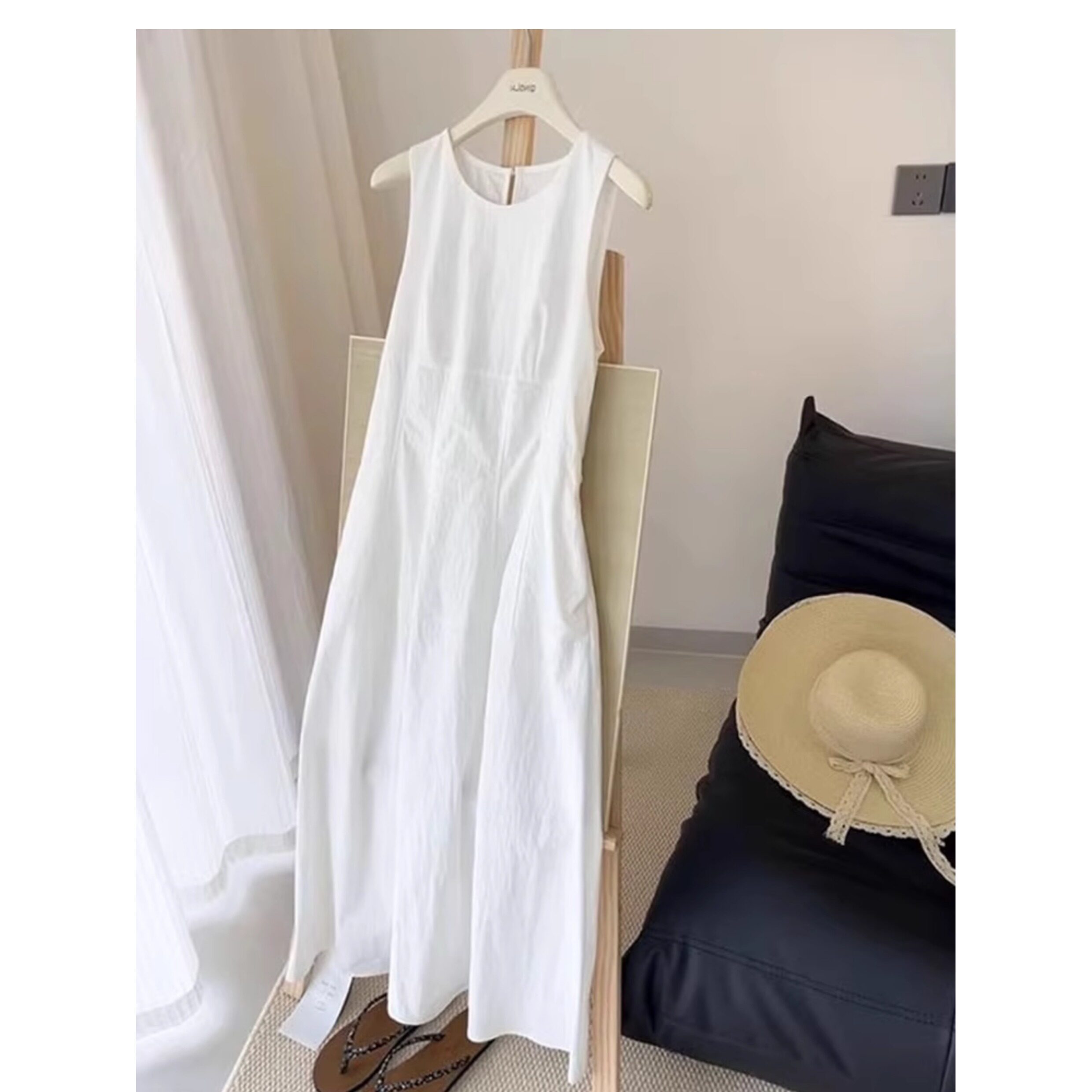 法式海边度假无袖背心裙女夏季亚麻大摆中长裙白色圆领收腰连衣裙