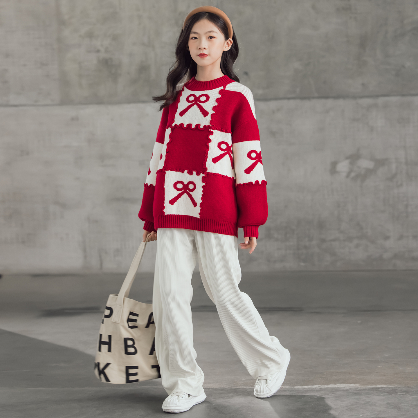过年圣诞红色提花毛衣女童秋冬红白格纹宽松慵懒风套头针织衫外套