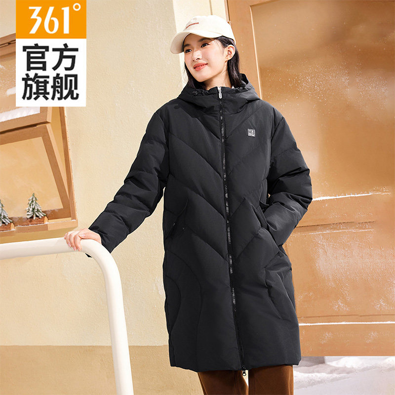 361羽绒服女款2025冬季新款保暖休闲中羽绒服女黑色连帽运动外套