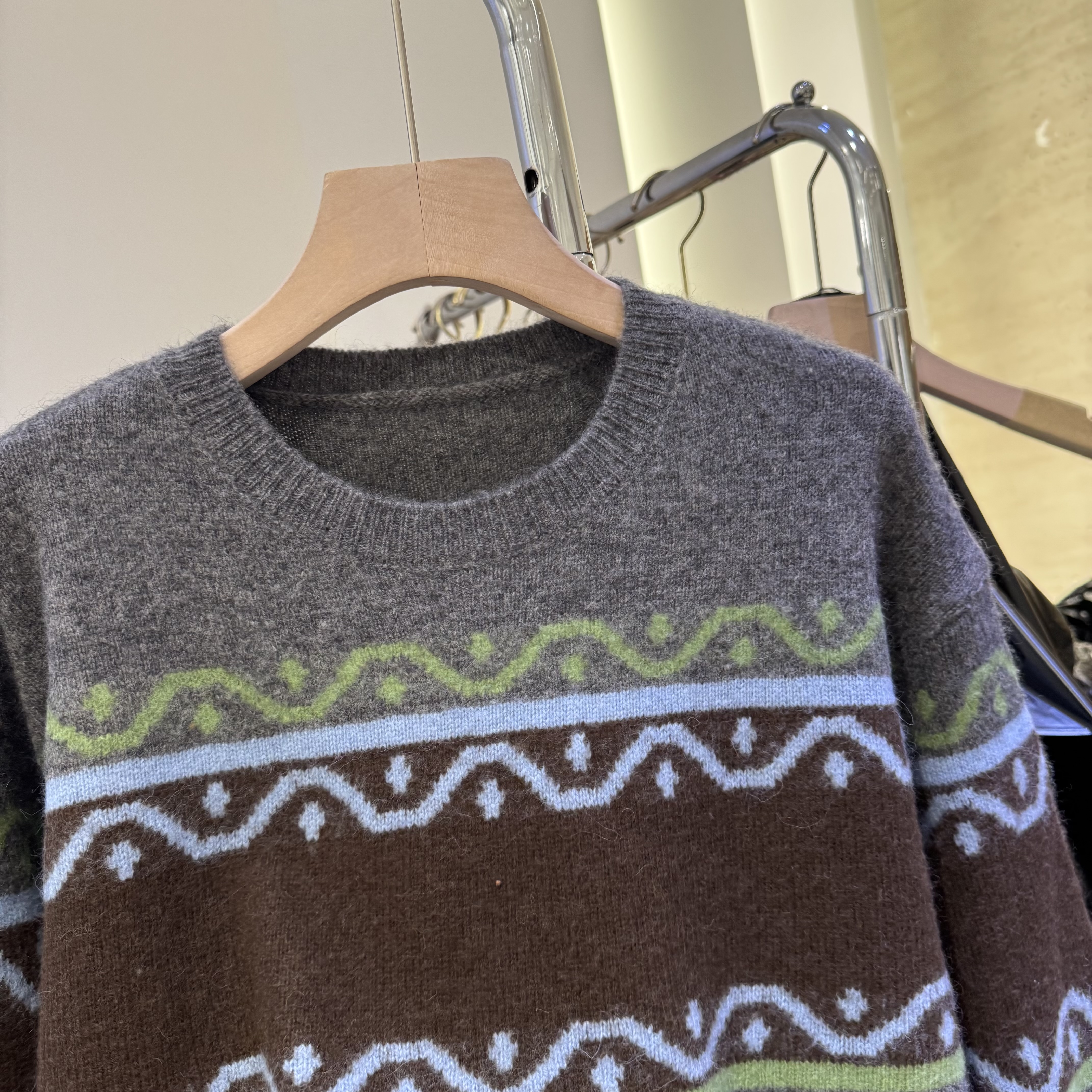 欧洲站2025秋季新款女士圆领绣花拼色羊驼毛长袖毛衣欧货宽松针织