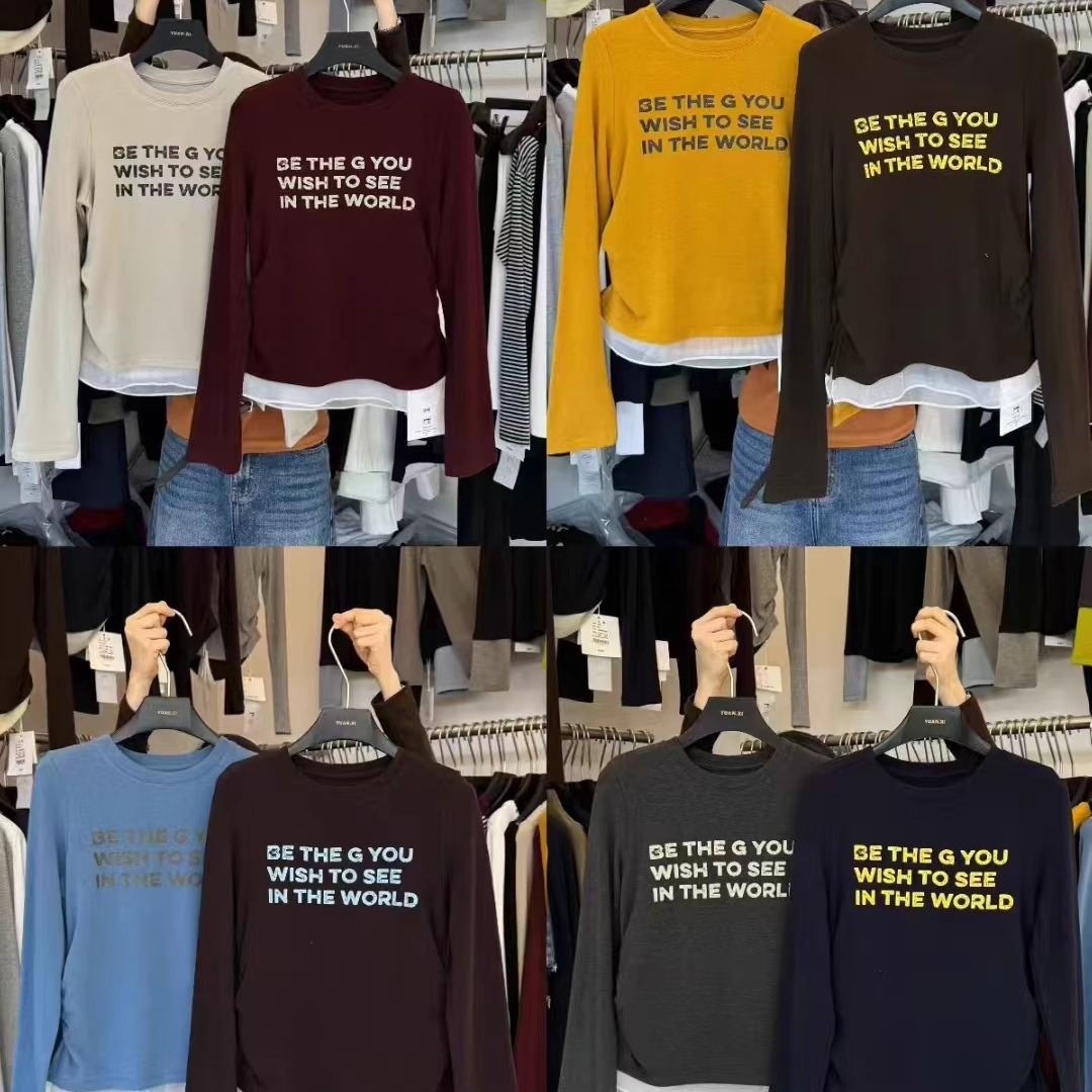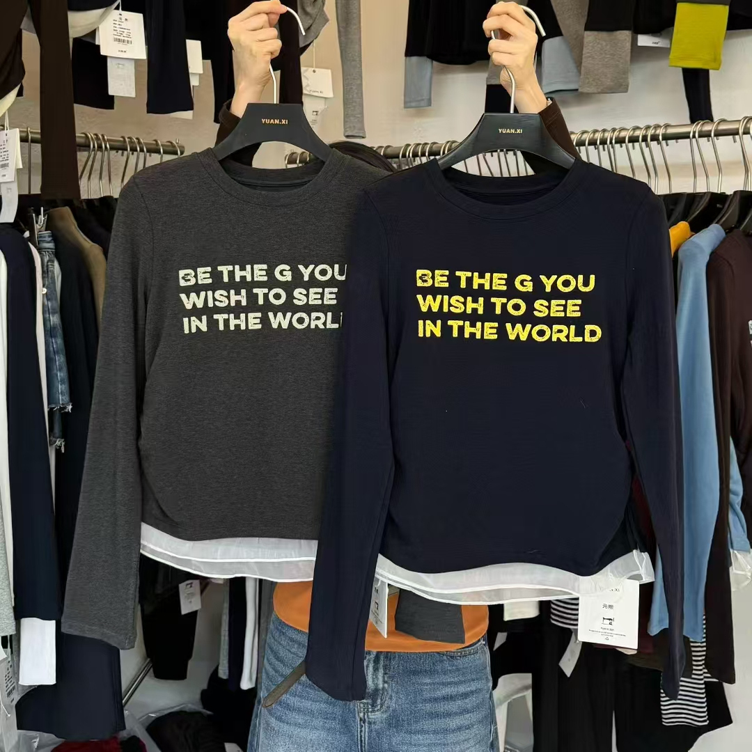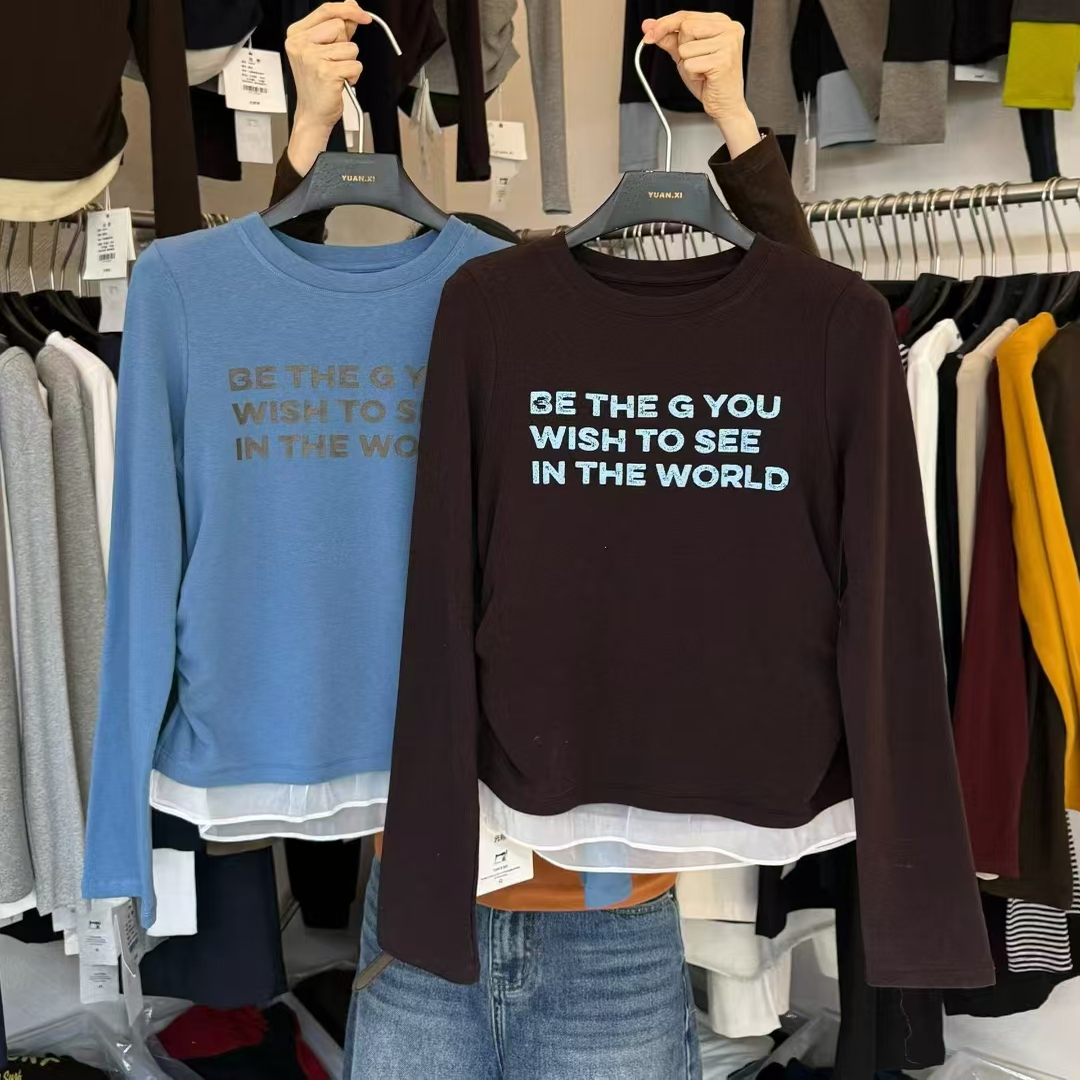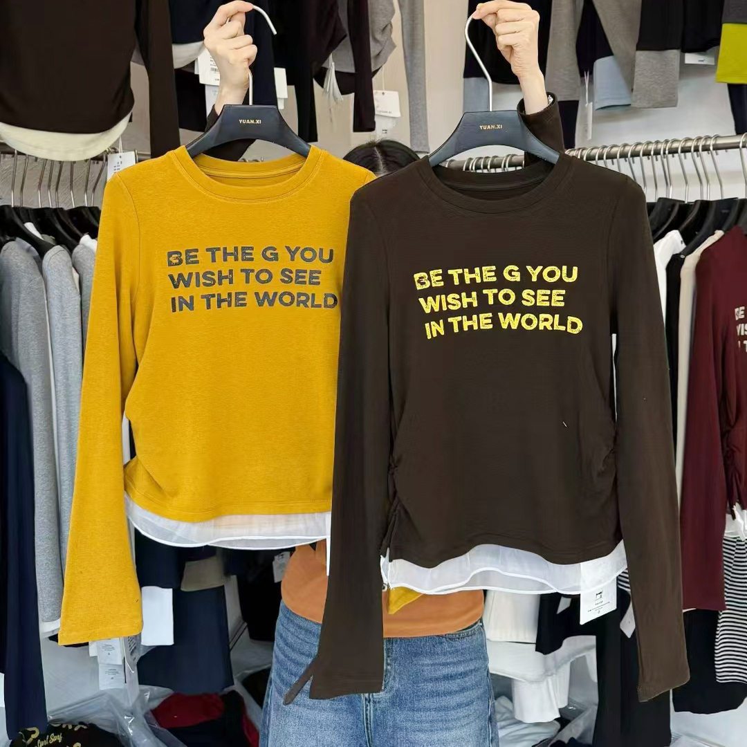 桐桐佳秋冬高弹加薄绒上衣圆领下摆拼接蕾丝开叉打底衫长袖可外穿