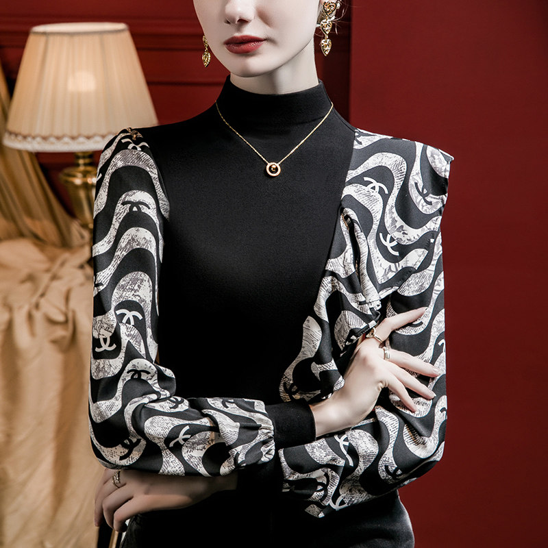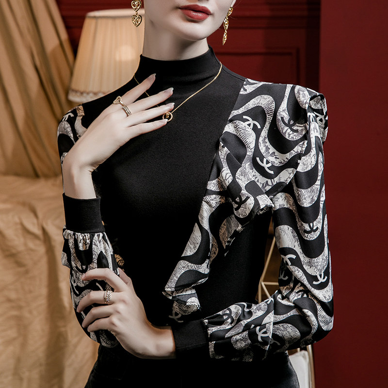 印花荷叶边雪纺拼接立领上衣女2025秋季新款洋气设计感T恤小衫