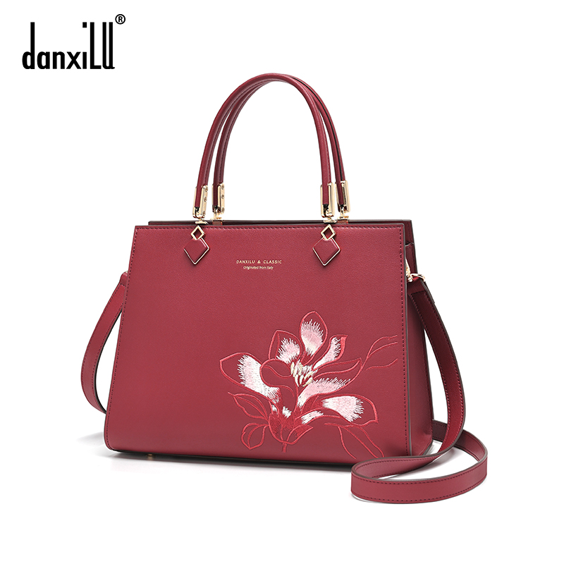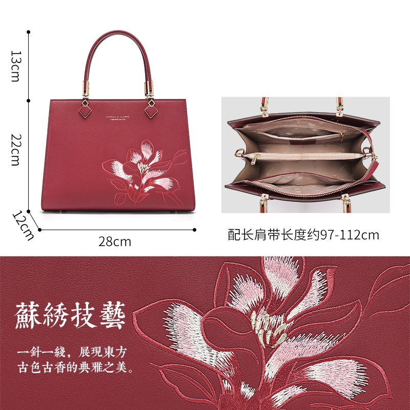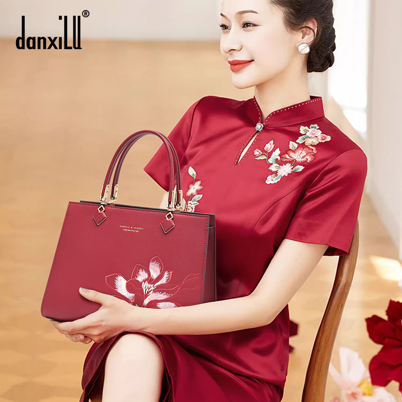 丹希路真皮女包新中式刺绣包包新款手提包结婚婚包婆婆妈妈包大气