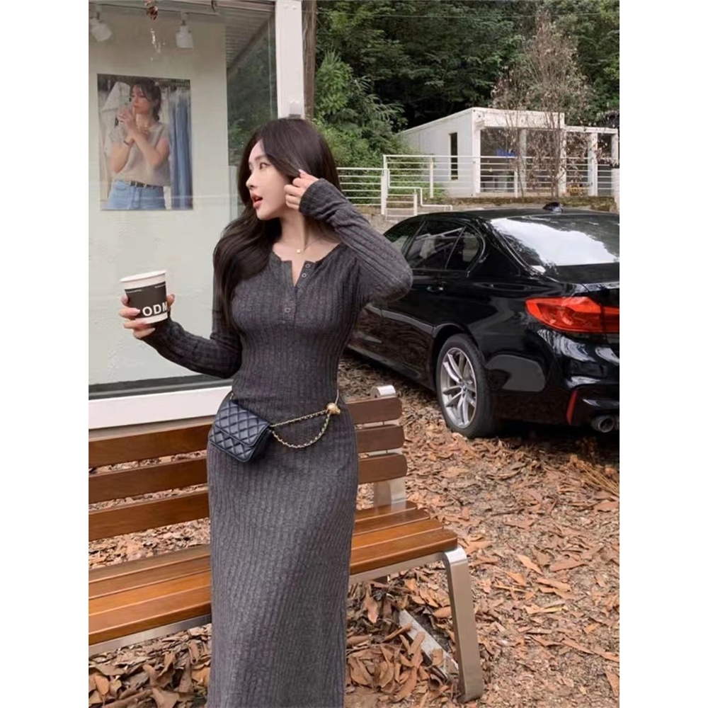修身复古正肩长袖针织连衣裙女装秋冬打底裙胖mm显瘦长裙小众裙子