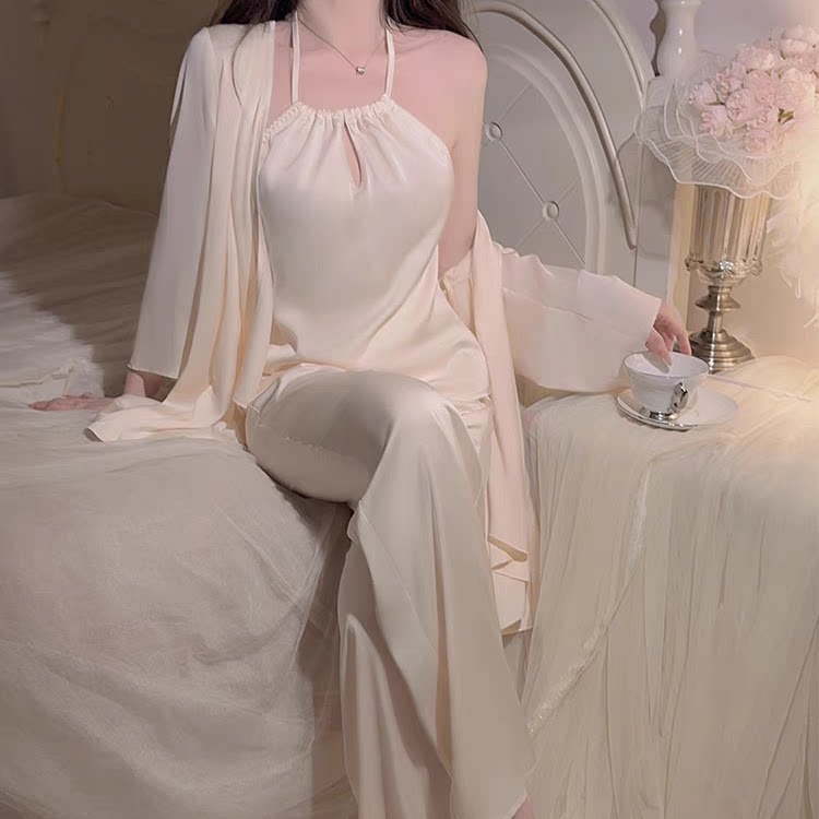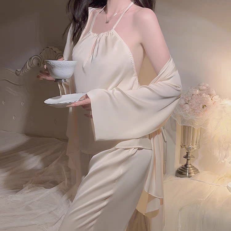 春夏款大码女装胖mm性感纯欲风睡衣套装挂脖露背冰丝家居服三件套