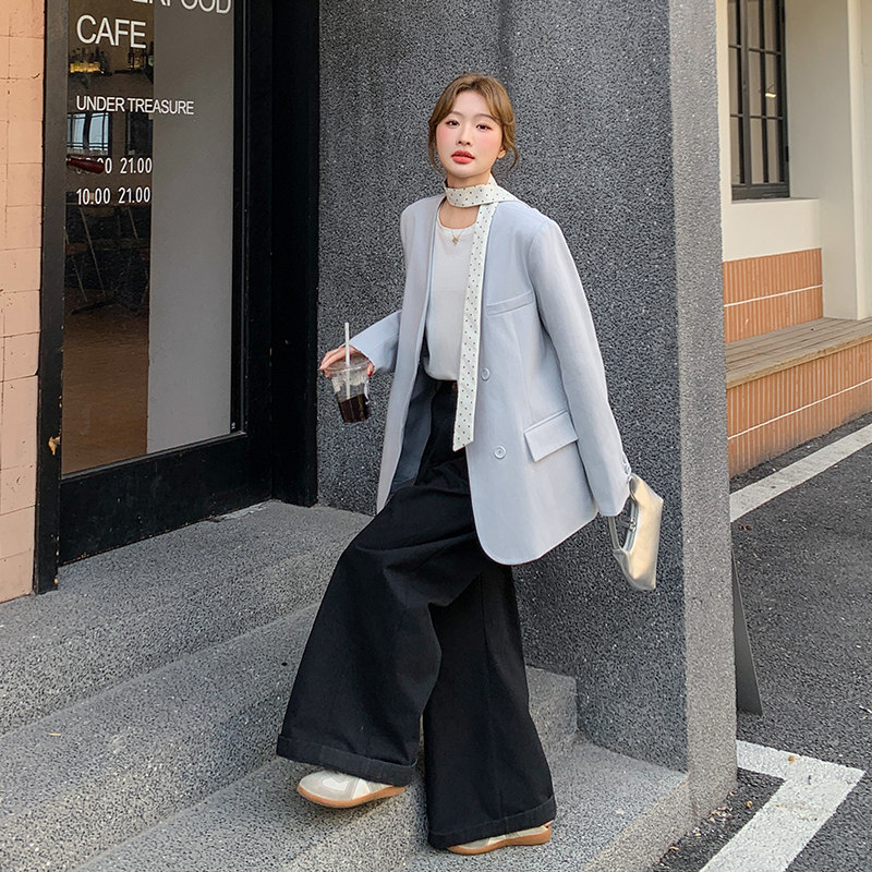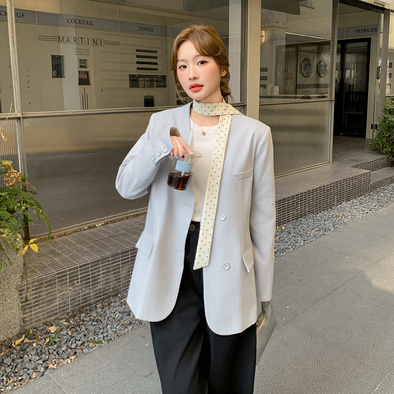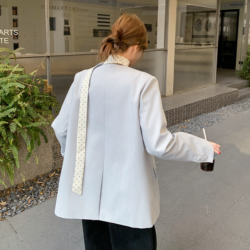 浅蓝色清冷感气质西服外套女2026春季新款飘带波点撞色拼接小西服