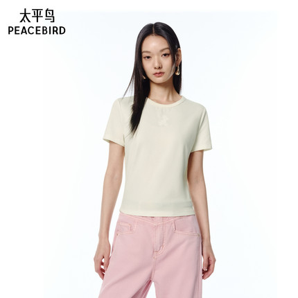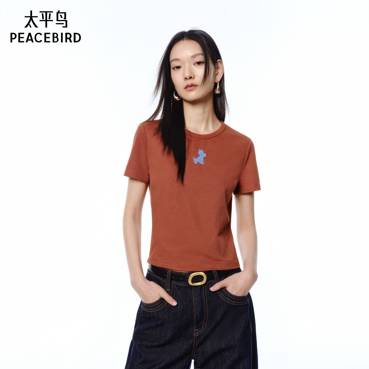 太平鸟 莱赛尔珠片绣小狗短袖T恤25夏季新款女士白色基础辣妹上衣