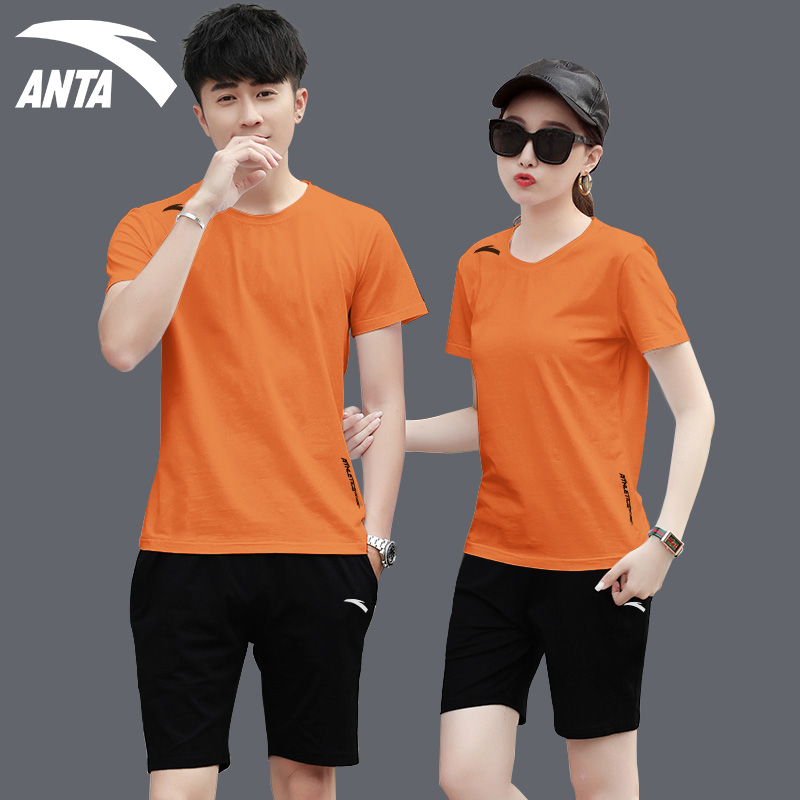 安踏运动套装男女红色夏季t恤五分裤团购情侣短袖短裤速干两件套
