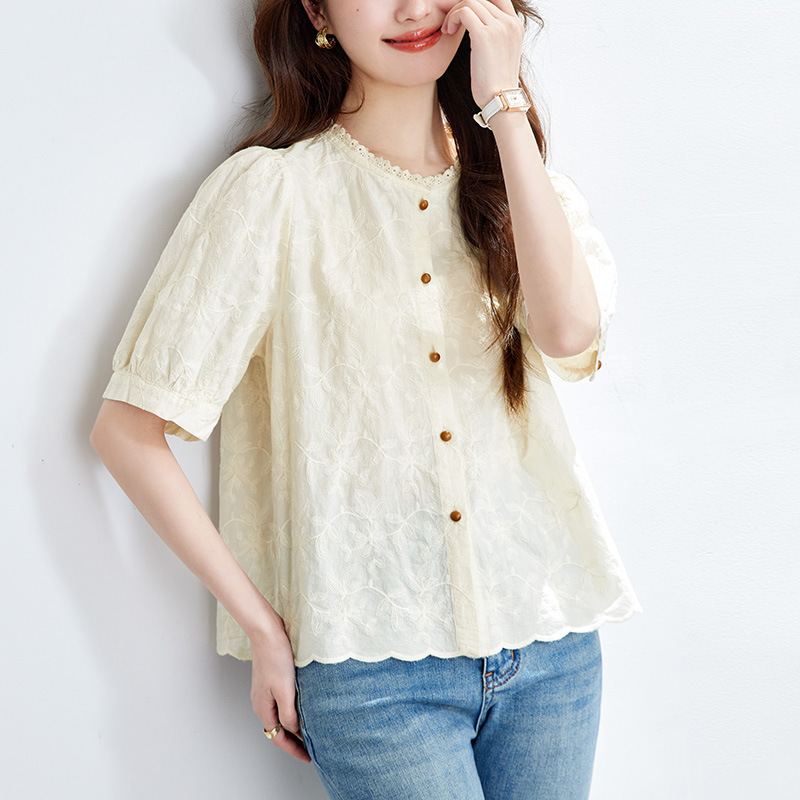 蕾丝花边圆领衬衫女五分袖2025夏季纯棉刺绣上衣宽松显瘦女式衬衣