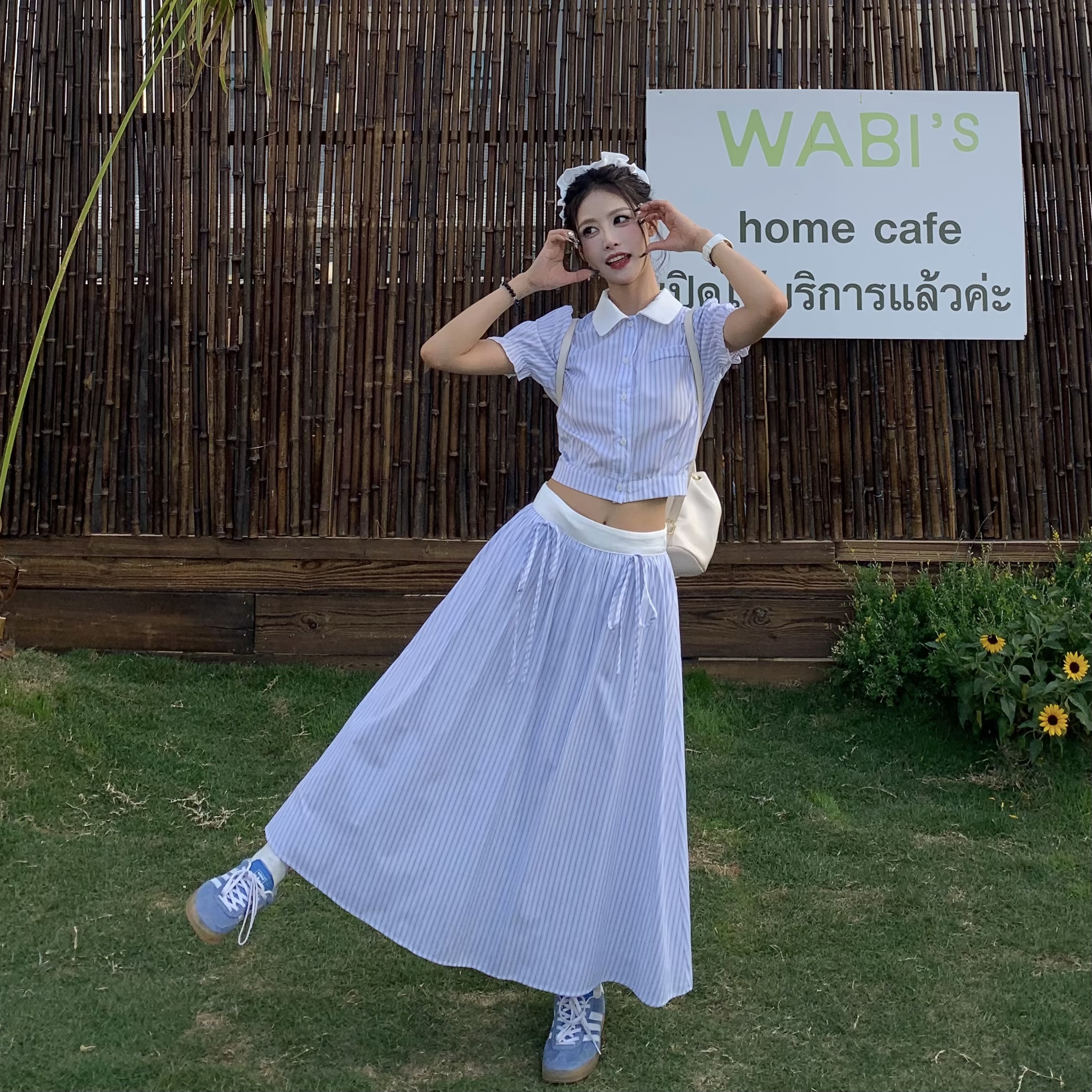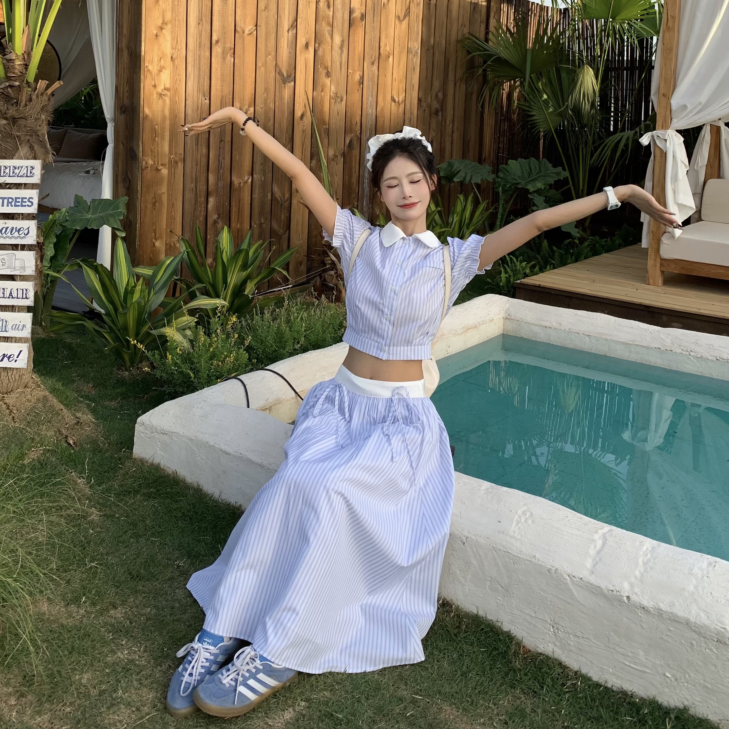 3MER哦哦三妹 韩系甜妹蓝色条纹套装裙女2025夏季爆款长裙两件套