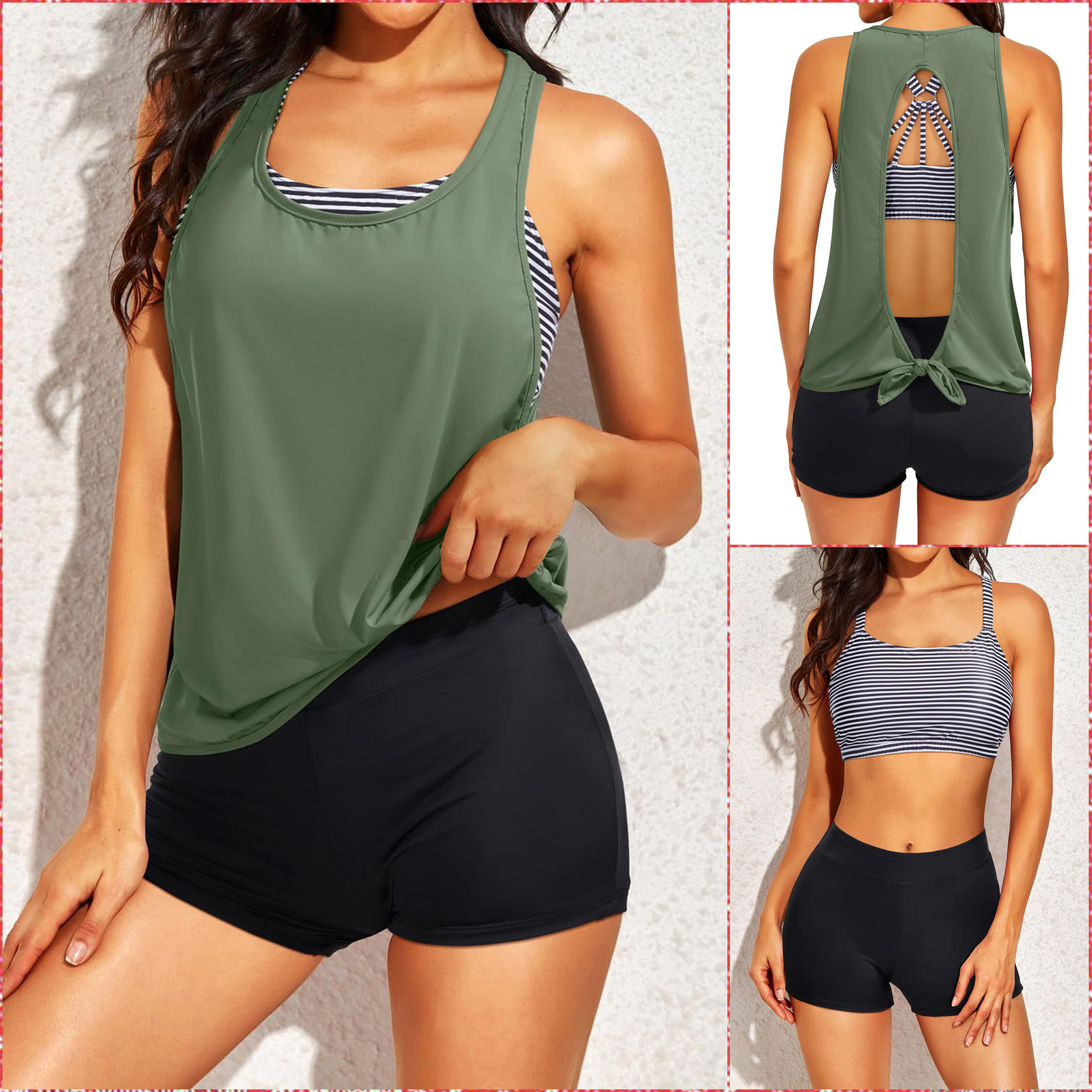 背心平角罩衫三件套泳装女欧美镂空露背花色遮肚胸垫运动速干游泳